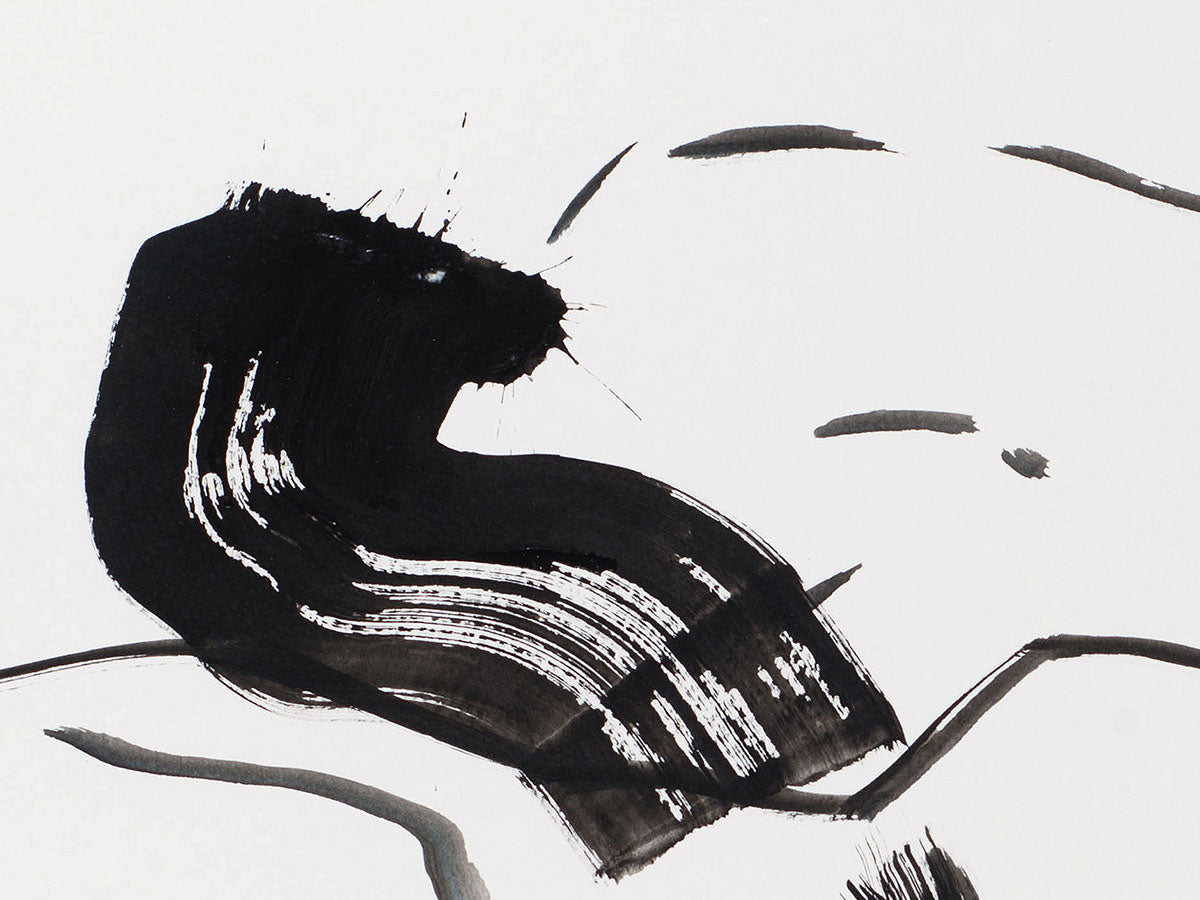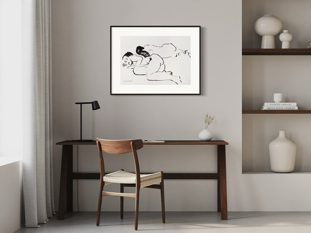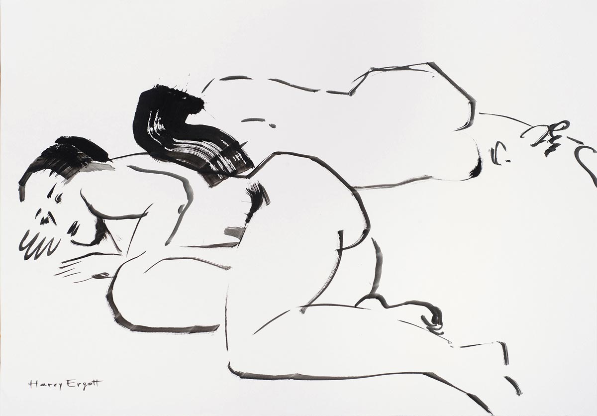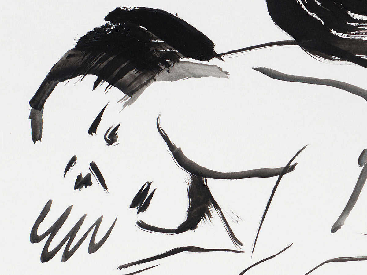 Mit wenigen, aber bestimmten Pinselzügen schafft Harry Ergott in Asian Love Story eine Szene intimer Nähe und flüchtiger Emotion. Die Darstellung zweier liegender Figuren entfaltet sich in einer minimalistisch-expressiven Formsprache, bei der Schwarz-Weiß-Kontraste dominieren. Der Fokus liegt nicht auf Details, sondern auf Geste, Bewegung und Stimmung. Das Spiel mit Leere und Linie verleiht dem Werk eine meditative Qualität – fast wie ein visuelles Haiku über Zärtlichkeit und menschliche Verbundenheit. Die Haarpartien, dynamisch und energisch gesetzt, bilden einen Kontrapunkt zur sanften Ruhe der Körperformen.