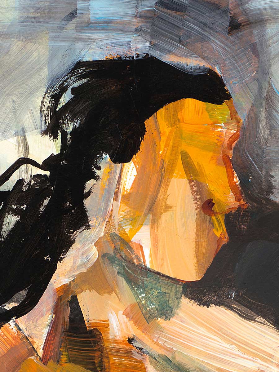 Die Komposition spielt mit Licht, Schatten und farblichem Kontrast – von warmen Hauttönen bis zu kühlen Blau- und Grüntönen, die Bewegung und Emotion einfangen. Die Haltung der Figur – abgewandt, in sich ruhend – verweist auf einen Moment der Erwartung, vielleicht Sehnsucht oder stille Introspektion.