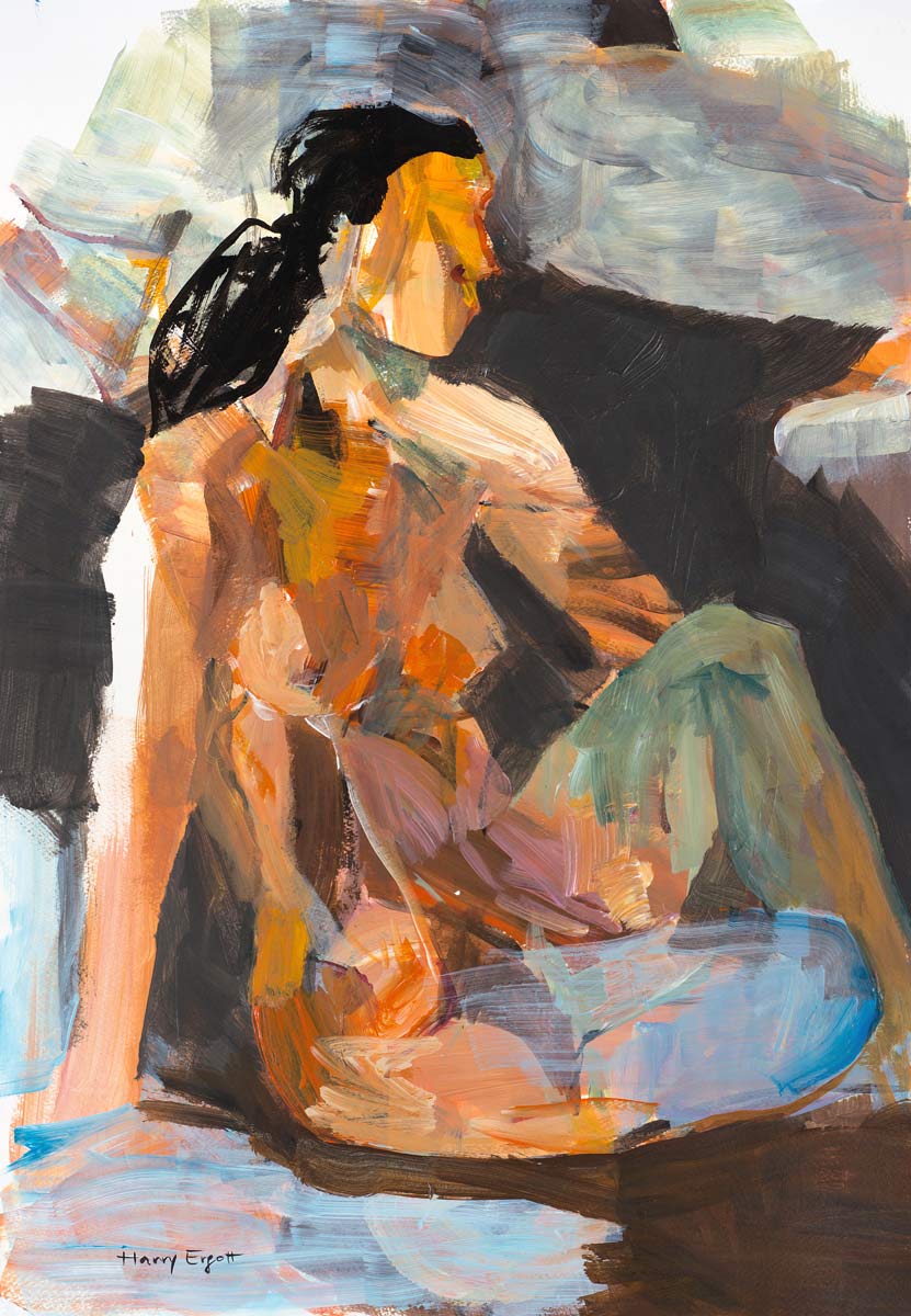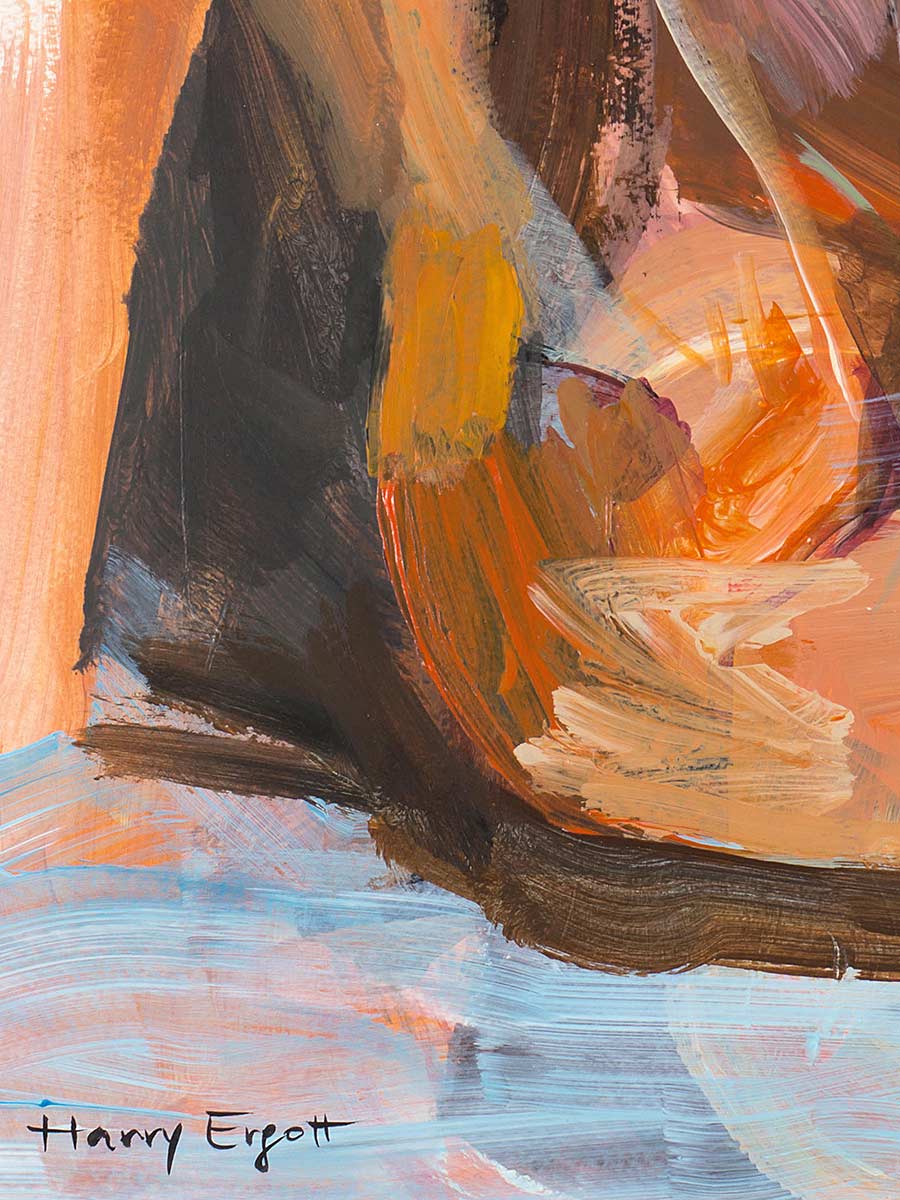 In Awaiting Love zeigt Harry Ergott seine charakteristische expressive Malweise: breite, gestische Pinselstriche verschmelzen zu einer sinnlichen Darstellung einer sitzenden weiblichen Figur. Trotz der abstrakten Annäherung bleibt die Körperlichkeit präsent und fesselnd.