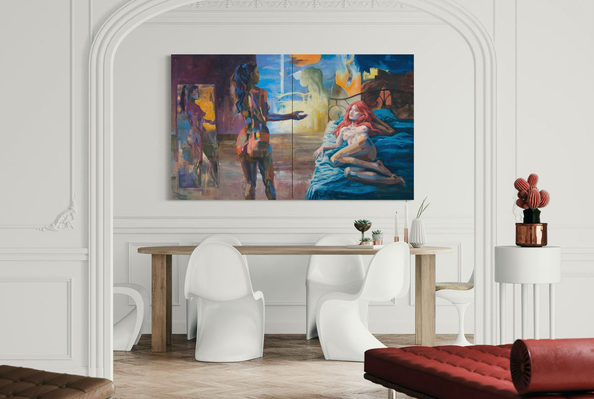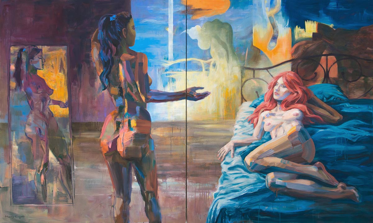 In „Brilliant Adventure“ erschafft Harry Ergott eine spannungsvolle Begegnung zwischen zwei weiblichen Figuren, die zwischen Intimität und Distanz schwebt. Die leuchtenden, pastos aufgetragenen Farbflächen verleihen den Körpern eine fast skulpturale Präsenz, während das Licht wie ein dritter Akteur den Raum durchdringt. Die Szene bewegt sich zwischen Traum und Realität, Spiegelung und Selbstwahrnehmung. Ergott spielt mit dem Blick – sowohl dem des Betrachters als auch dem der Figuren aufeinander. Das Werk thematisiert Identität, Projektion und das fragile Gleichgewicht zwischen Nähe und Selbstbestimmung. In seiner expressiven Farbigkeit und Komposition verbindet Ergott klassische Aktmalerei mit zeitgenössischer Emotionalität.