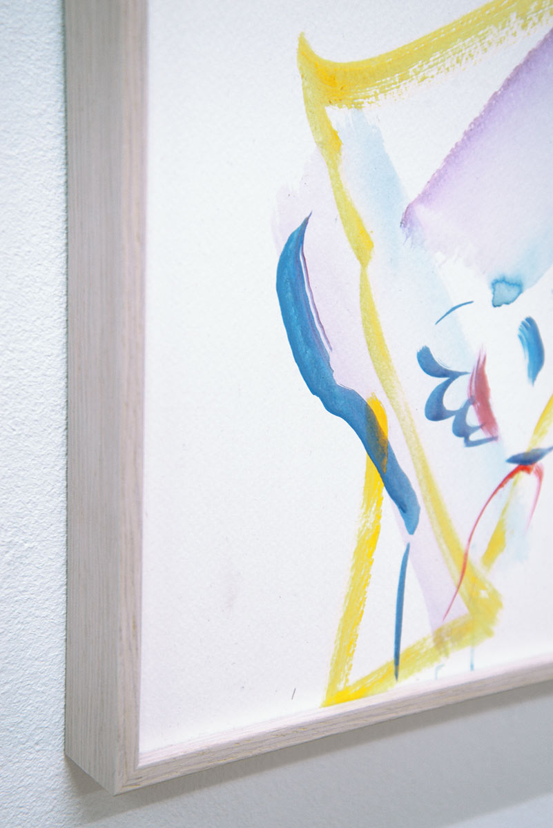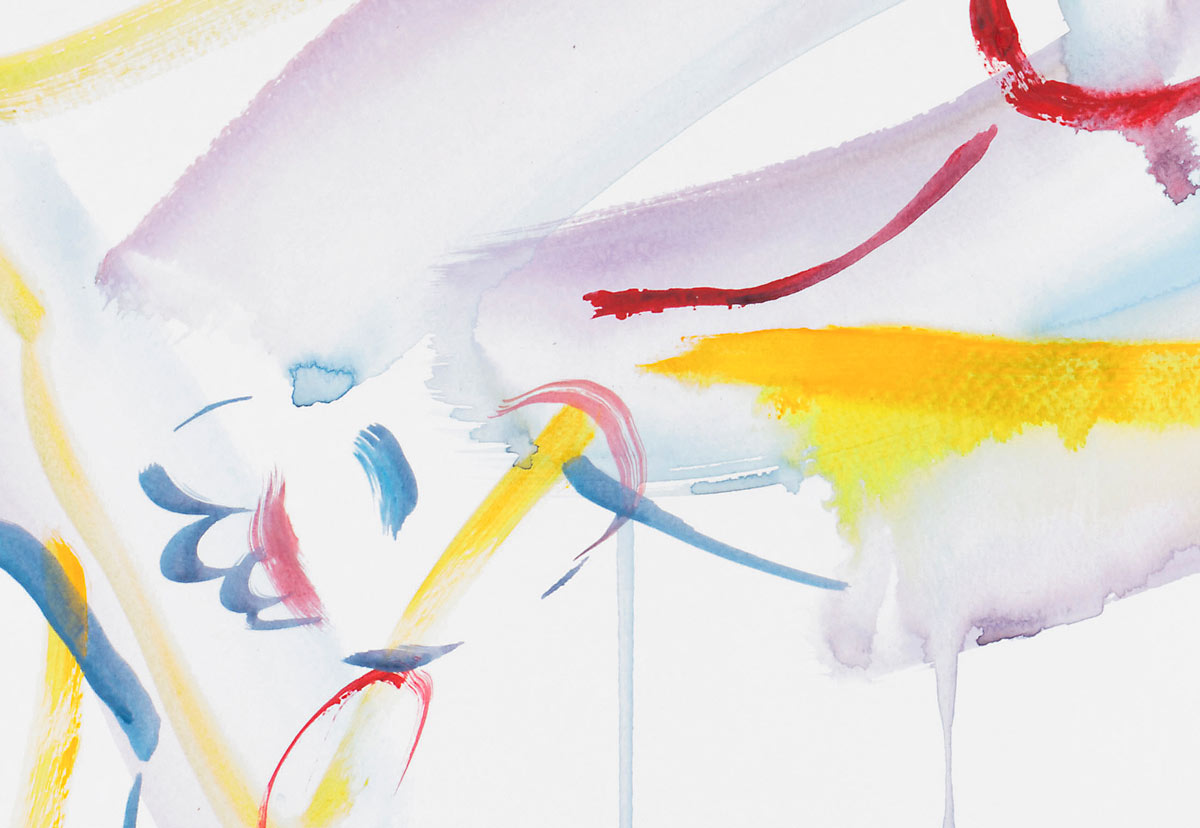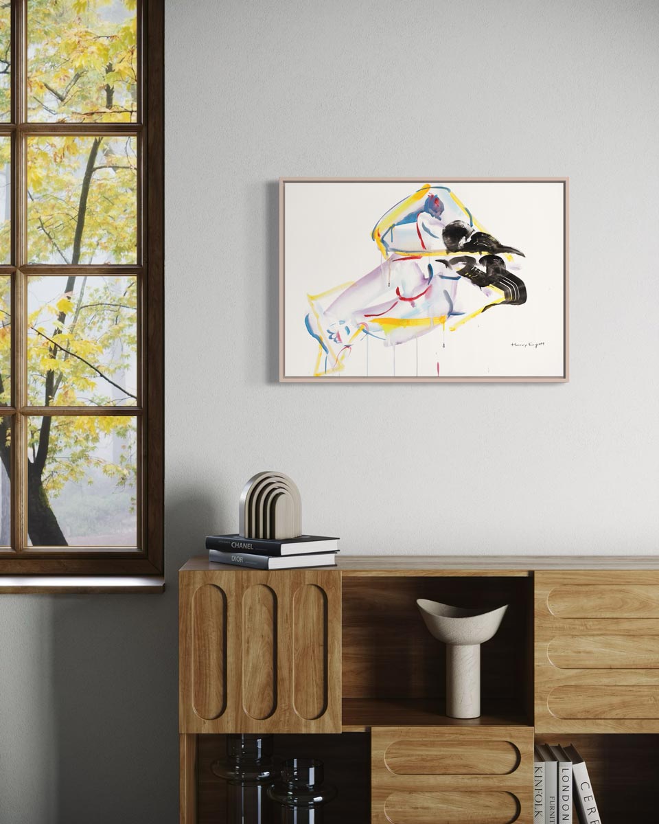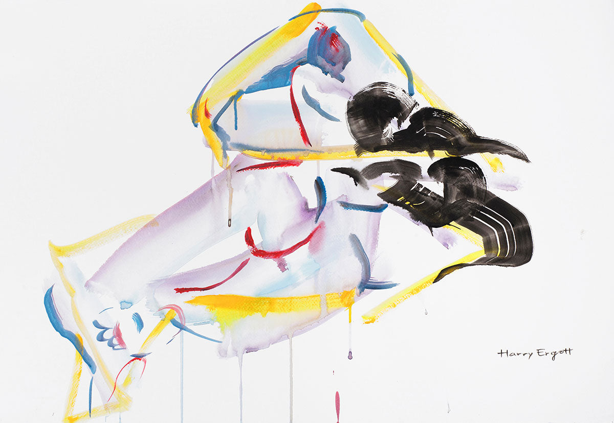 Ergott arbeitet hier mit einer reduzierten, fast tänzerischen Linie, die den Körper mehr suggeriert als definiert. Gelb, Rot, Blau und Violett verleihen dem Werk Energie und Emotionalität, während der weiße Hintergrund Raum zum Atmen lässt. Die schwarzen, fast grafischen Akzente wirken wie ein Gegenpol zur Leichtigkeit der restlichen Komposition.