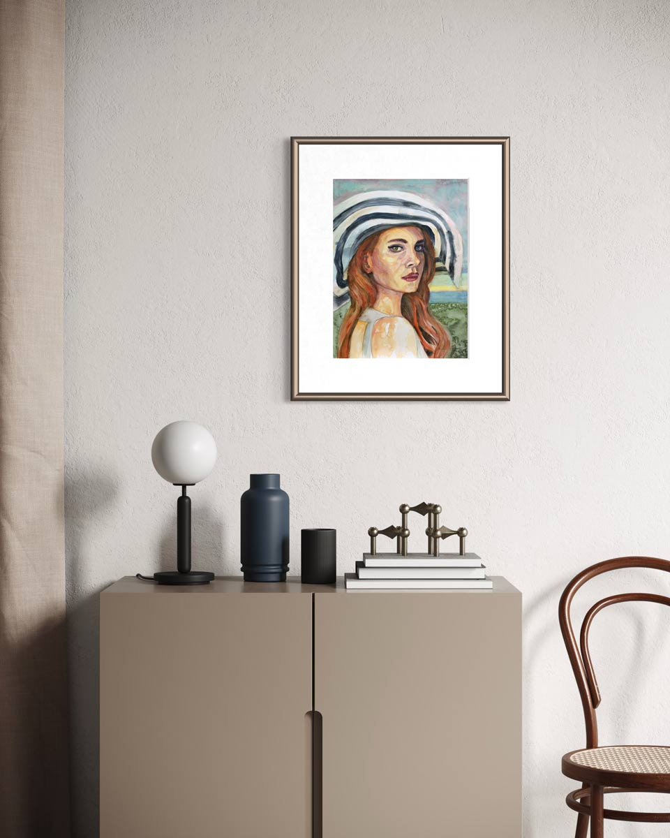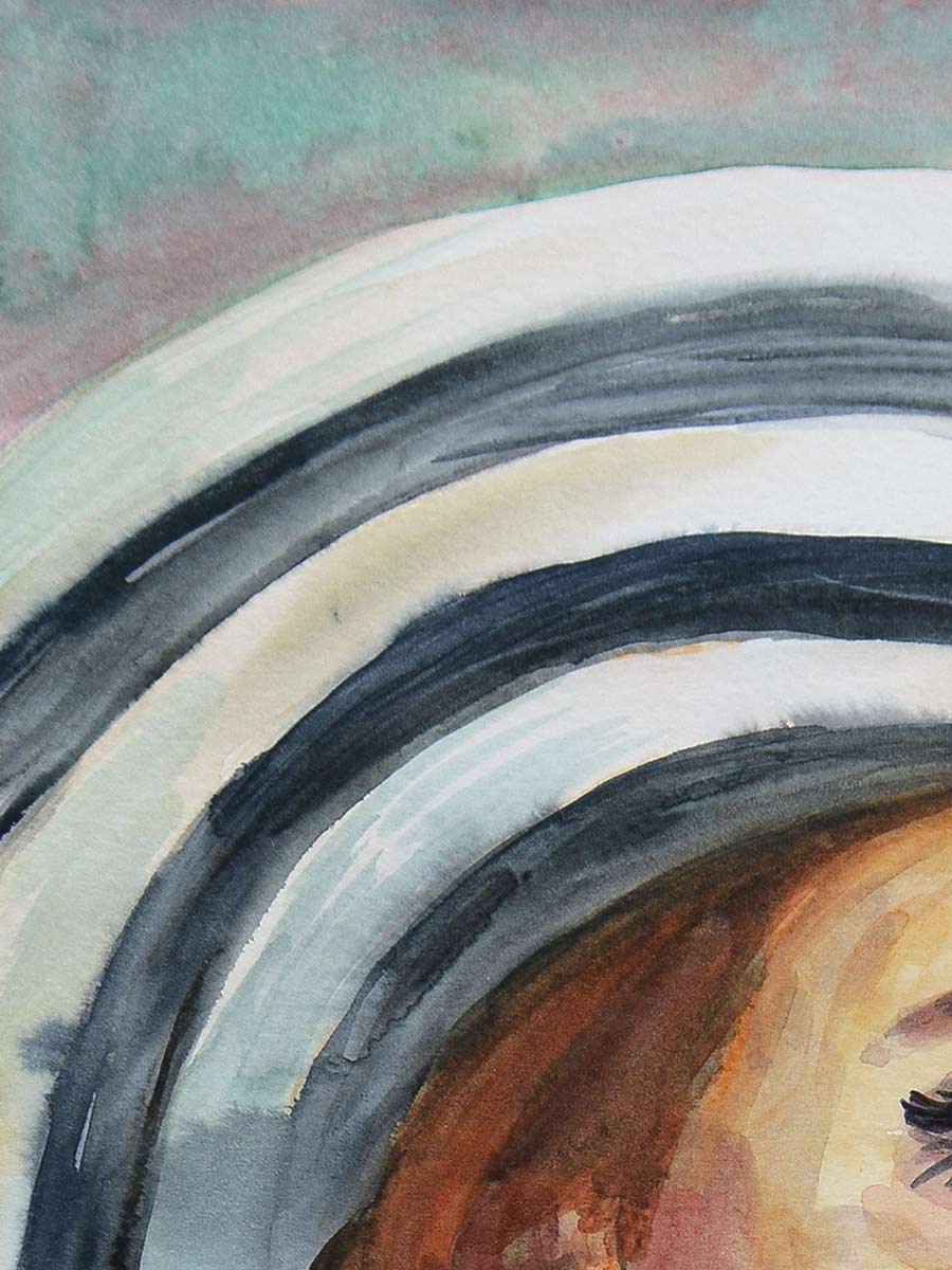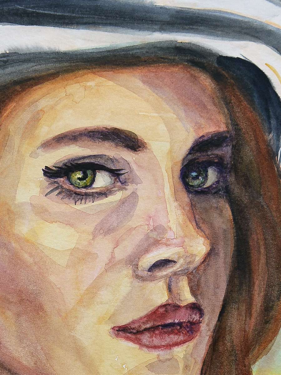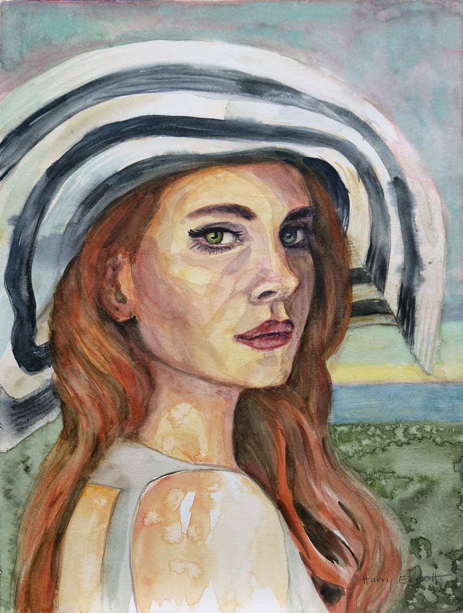 Harry Ergott widmet dieses Aquarell der Musikerin Lana Del Rey, deren melancholische Aura und ikonische Erscheinung ihn zu einer subtilen, zugleich intensiven Porträtstudie inspirierten. Mit feinen Lasuren und weichen Übergängen fängt Ergott die poetische Spannung zwischen Stärke und Verletzlichkeit ein, die Del Reys Kunst prägt. Die kühle Transparenz des Aquarells kontrastiert mit der warmen Farbigkeit ihres Haares und der sanften Modellierung des Gesichts. Der weit geschwungene Hut rahmt die Figur und betont ihre zeitlose Eleganz – ein Bild, das Musik, Gefühl und Bildsprache zu einer harmonischen Einheit verbindet.