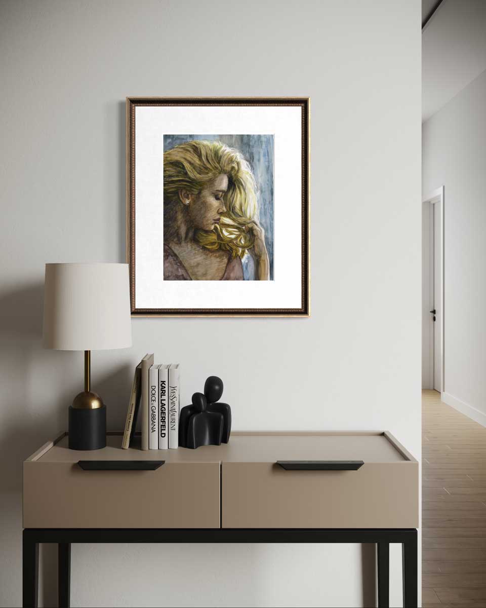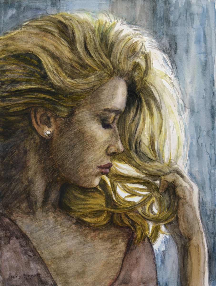 Ergott nutzt die Transparenz des Aquarells meisterhaft: Lasur über Lasur entsteht eine feine Balance zwischen Detail und Atmosphäre. Die weichen Übergänge, die subtilen Schatten und das zarte Spiel von Licht auf Haut und Haar verleihen dem Bild eine intime, fast poetische Stimmung. Die kühlen Hintergrundtöne kontrastieren harmonisch mit den warmen Farbakzenten und verstärken so den Fokus auf die Figur.