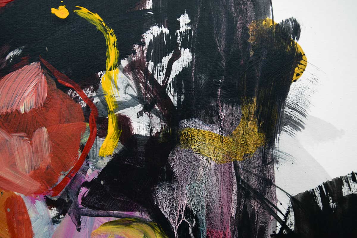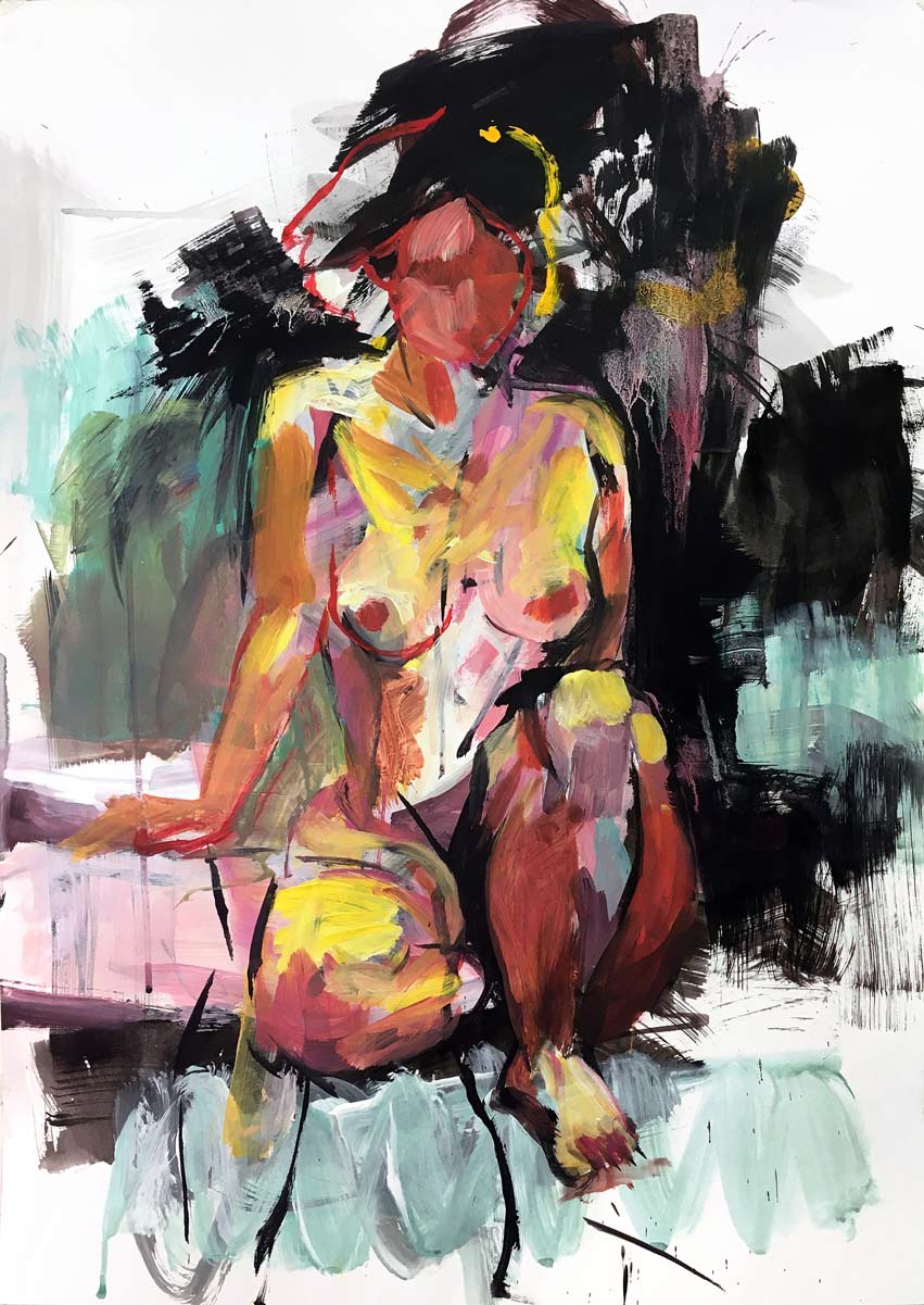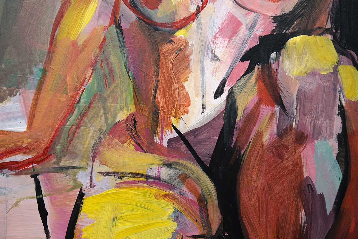 Die Farbpalette ist ebenso impulsiv wie durchdacht: Warme Gelb- und Rosatöne kontrastieren mit tiefem Schwarz und kühlem Türkis, wodurch die Figur förmlich aus dem Hintergrund hervorsticht. Die unvollständig angedeuteten Gesichtszüge lassen Raum für Projektionen und laden zur introspektiven Betrachtung ein.