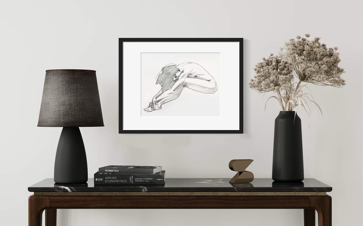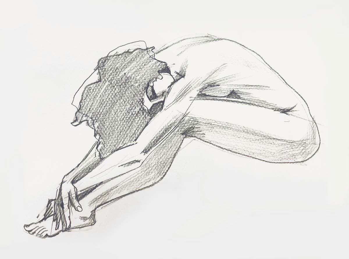 Mit Stretching zeigt Harry Ergott eine ruhige, intime Momentaufnahme – eingefangen mit sparsamen, aber präzisen Linien. Die sitzende Figur ist in sich gekehrt, der Körper zu einer geschlossenen Form zusammengerollt. Trotz der reduzierten Mittel strahlt die Zeichnung eine starke körperliche Präsenz und Verletzlichkeit aus. Die feine Schraffur und der sensible Umgang mit Licht und Schatten verleihen dem Akt eine fast skulpturale Qualität. Ergott beweist hier einmal mehr sein Gespür für das Wesentliche und die Ausdruckskraft der Linie. Die Arbeit steht exemplarisch für seinen zurückhaltenden, doch eindringlichen Zeichenstil.