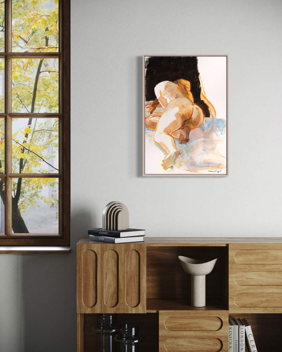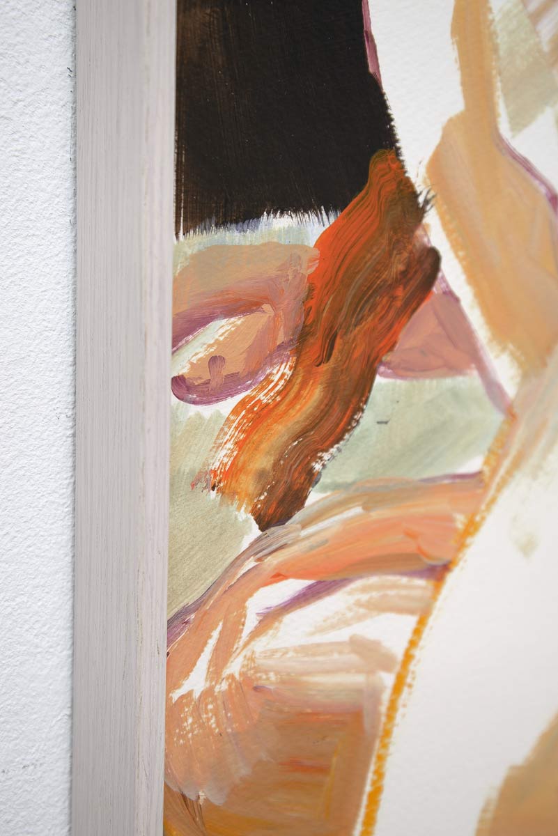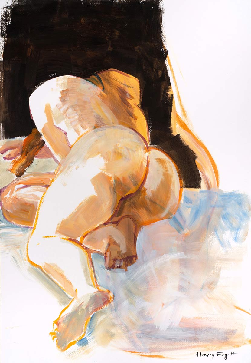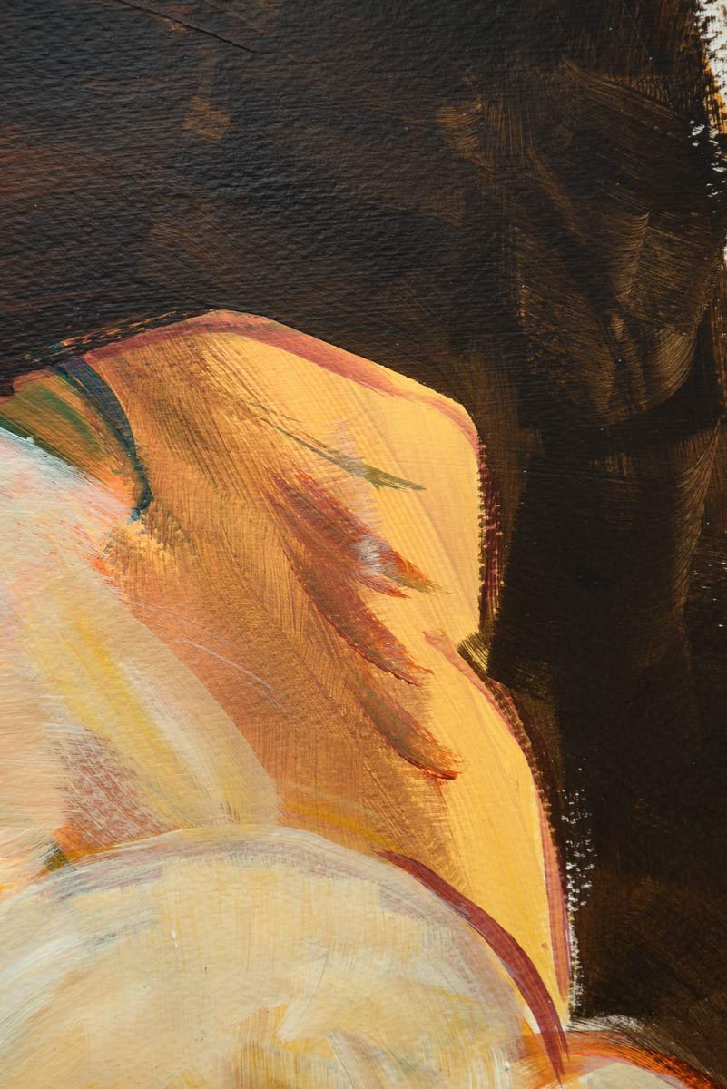 The Black Veil ist ein kraftvolles Werk von Harry Ergott, das durch seine körperbetonte Komposition und expressive Malweise besticht. Die Figur ist in einer fast skulpturalen Haltung dargestellt, geborgen im Moment des Rückzugs, vor einem schwarz-braunen Hintergrund, der wie ein Schleier über der Szene liegt.