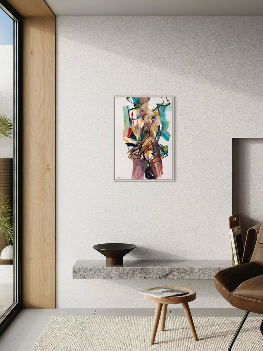 Mit The Guardian erschafft Harry Ergott eine kraftvolle und zugleich geheimnisvolle Figur, die sich zwischen Abstraktion und Figuration bewegt. Der Körper erscheint nur fragmentarisch, zusammengesetzt aus impulsiven Pinselstrichen, kraftvollen Farben und einer fast tänzerischen Linienführung. Der dominante Einsatz von Türkis-, Erd- und Rosétönen erzeugt ein spannungsreiches Farbklima, das sowohl Schutz als auch Verletzlichkeit suggeriert. Die Pose – eine rückwärtige Ansicht mit überkreuzten Armen – wirkt wie eine Geste des Rückhalts oder der Abwehr. So öffnet das Bild einen Interpretationsraum für Themen wie Stärke, Verantwortung und emotionale Präsenz. Ergott gelingt es einmal mehr, die Grenze zwischen Sichtbarem und Gefühltem verschwimmen zu lassen.
