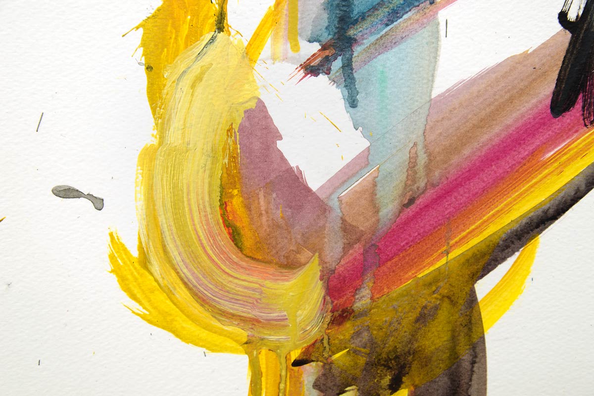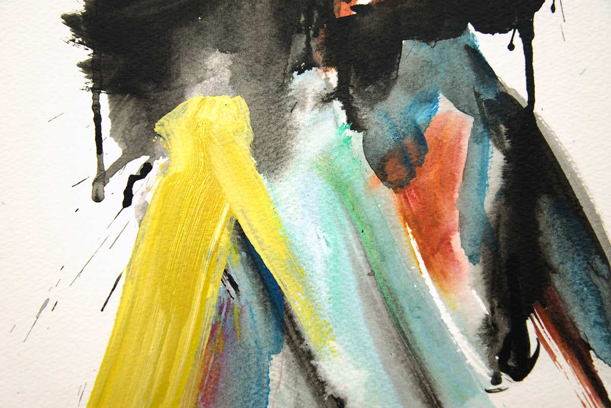 Der Bildtitel verweist auf eine gewisse Ungezähmtheit: Die “wilde Rose” ist keine klassische Schönheit, sondern Ausdruck von Individualität, Freiheit und Stärke. Kräftige Gelb-, Pink- und Türkistöne verbinden sich mit dunklen Konturen zu einer Figur, die sich zwar in sich kehrt, dabei aber voller Leben pulsiert. Die weiße Leere des Papiers wird nicht als Hintergrund, sondern als aktives Element der Komposition genutzt – ein offener Raum, der die Figur zum Strahlen bringt.
