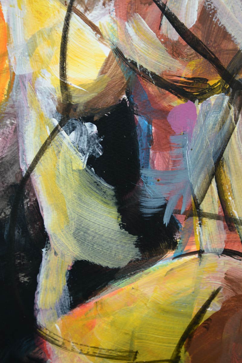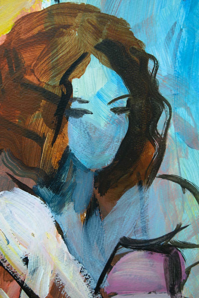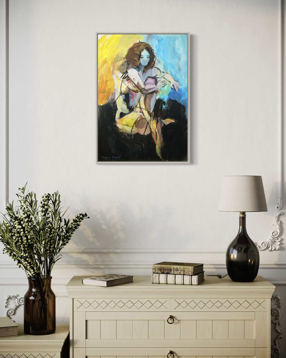 Das Werk oszilliert zwischen Abstraktion und Figuration, zwischen Intuition und Präzision. Es ist eine Einladung, das Fragmentarische als Stärke zu sehen – ein visuelles Echo der Leidenschaft und Verletzlichkeit menschlicher Begegnung. Die Position der Figur, eingefangen in einer Geste zwischen Rückzug und Öffnung, macht das Bild zu einem intimen emotionalen Spiegel.
