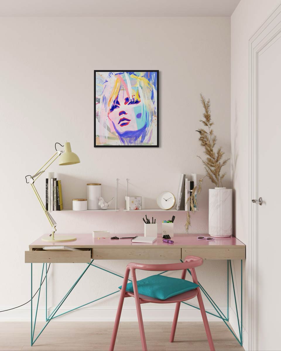 Harry Ergott verleiht in seinem farbintensiven Porträt der Punk-Ikone Debbie Harry eine neue visuelle Energie. Mit expressivem Pinselstrich, überlagerten Farbflächen und leuchtenden Kontrasten schafft Ergott eine spannungsreiche Verbindung zwischen Pop-Art, Street-Art und abstraktem Expressionismus.