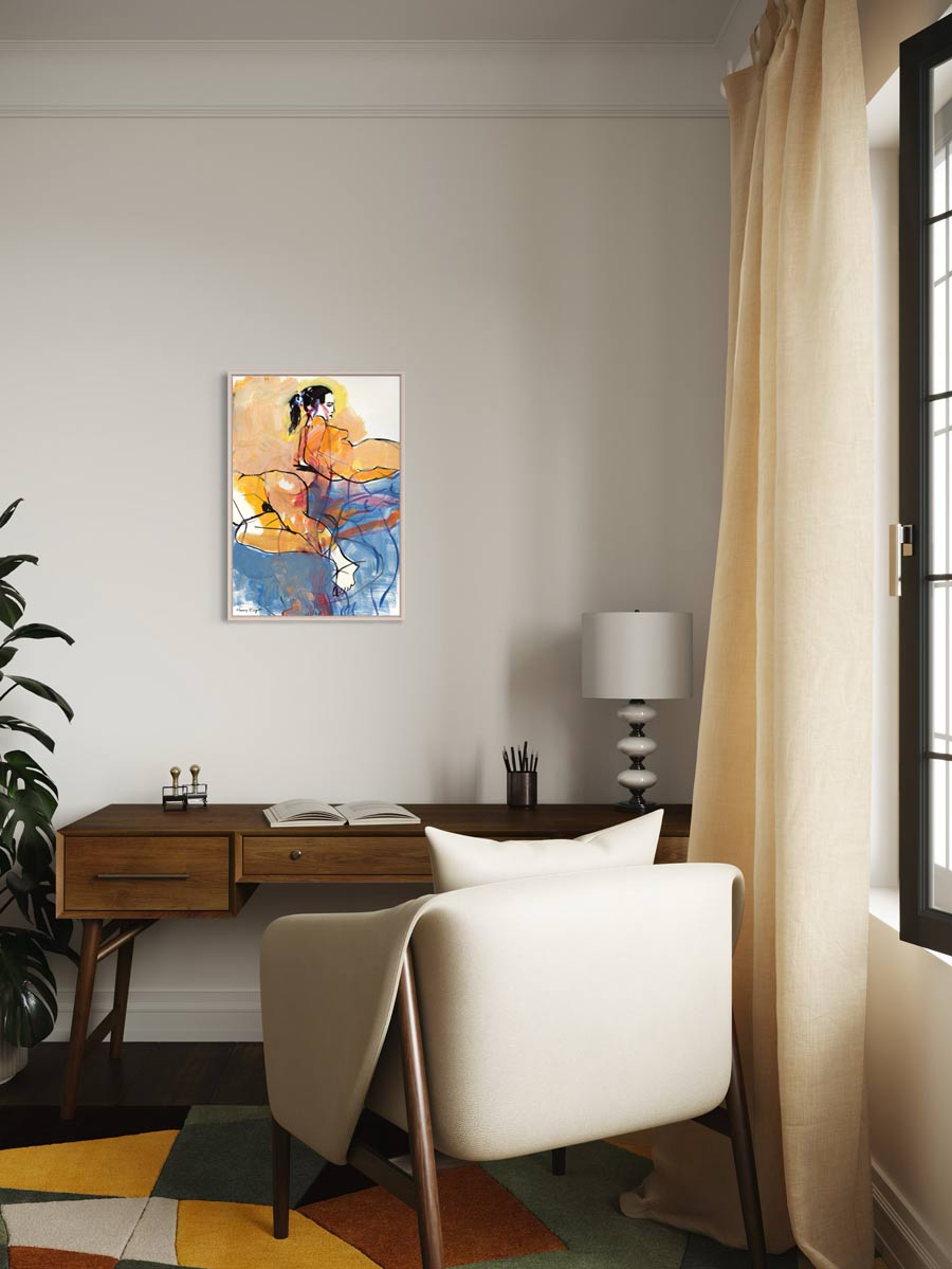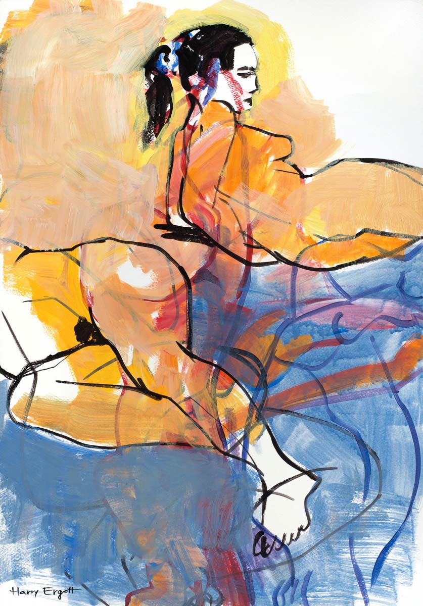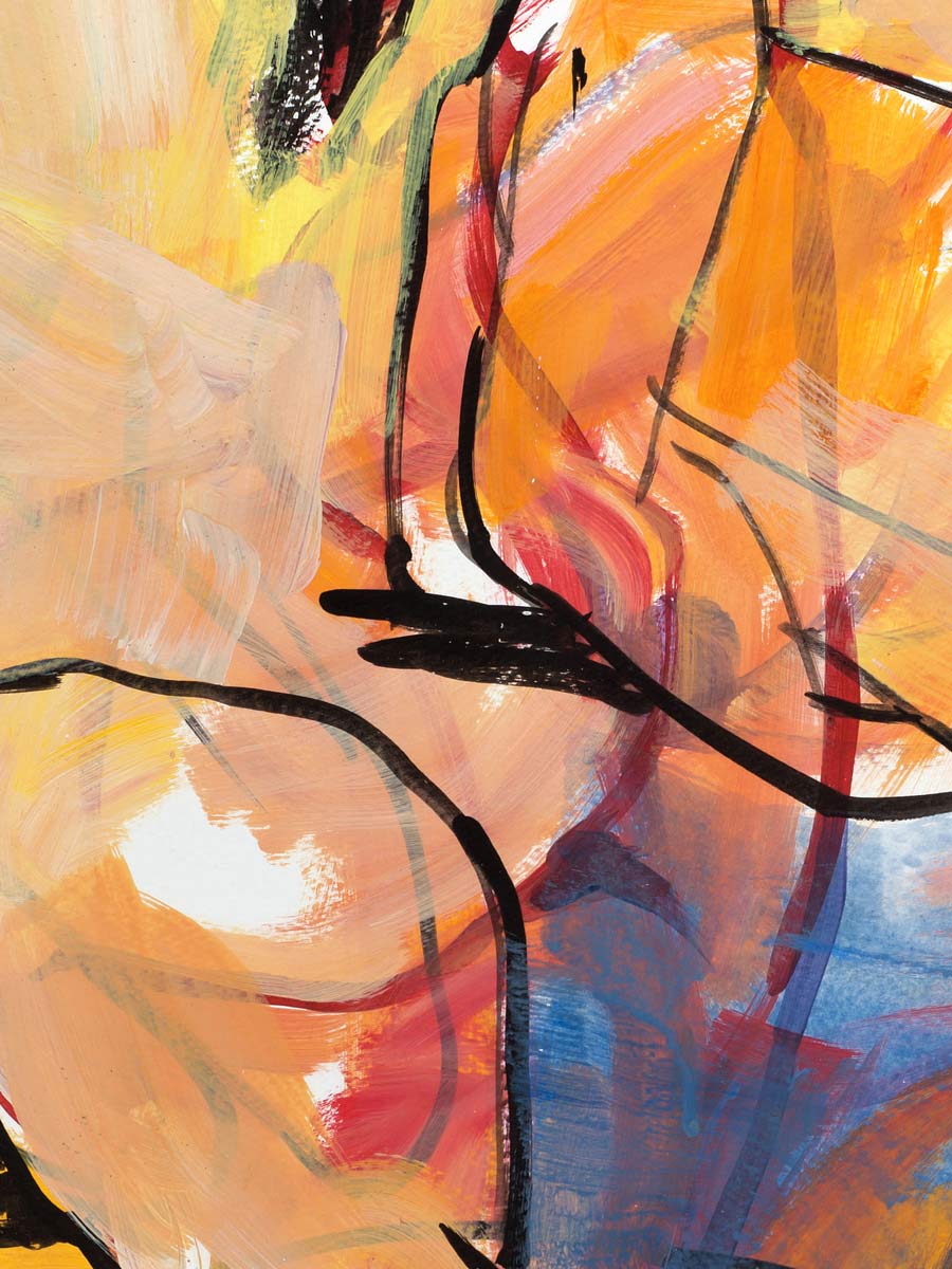 In Deeply Connected lässt Harry Ergott zwei weibliche Figuren in einem spannungsvollen Zusammenspiel aus Linie, Farbe und Fläche miteinander verschmelzen. Die lebendige Farbpalette aus warmen Orangetönen, intensiven Blauschattierungen und akzentuierendem Schwarz erschafft eine visuelle Dynamik, die zwischen Nähe und Abgrenzung pendelt. Die fragmentarische Überlagerung der Körper evoziert das Gefühl von Intimität und innerer Verbundenheit – ohne klare Trennungslinien, aber voller emotionaler Präsenz. Der expressive Pinselstrich und die abstrahierende Linienführung erzeugen einen fast tänzerischen Rhythmus, der das Thema der tiefen Verbindung eindrucksvoll visualisiert.