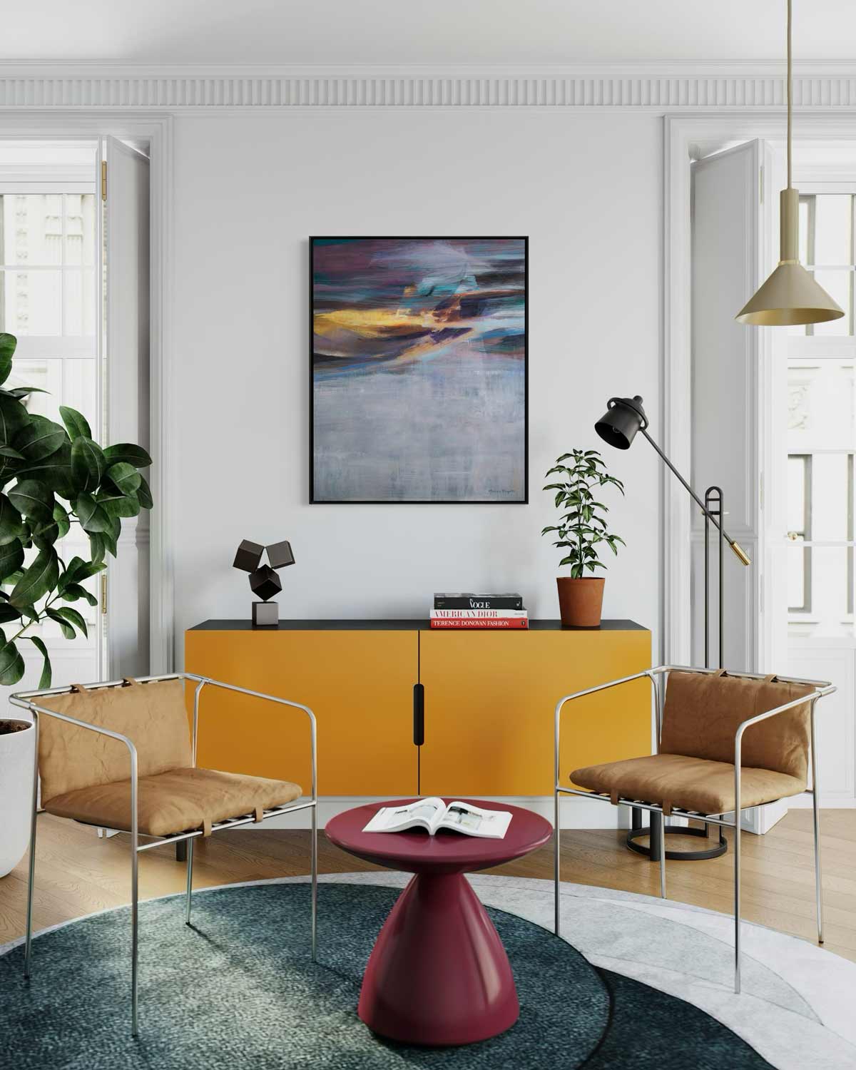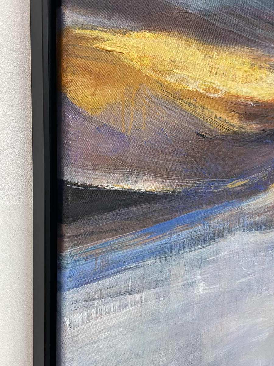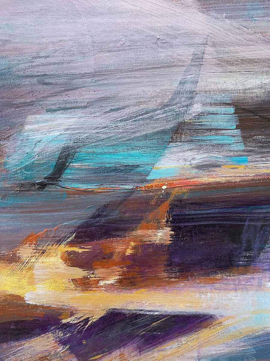 Im oberen Bereich dominieren warme Erdtöne, Violett und Türkis, durchzogen von einem fast flammenden Gelb, das sich wie ein Lichtstrahl über die Komposition zieht. Diese expressive Energie fließt in einen ruhigeren unteren Bildteil über, der in pastellartigen Grau- und Blautönen gehalten ist. Hier löst sich die Form auf, die Textur wird feiner, beinahe neblig – ein Kontrast, der das Werk zwischen Emotionalität und meditativer Stille verortet.