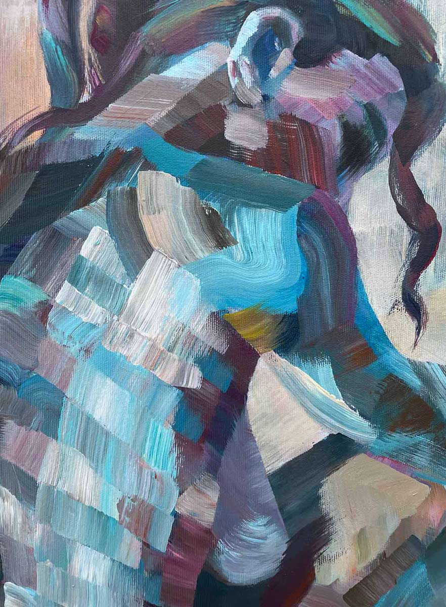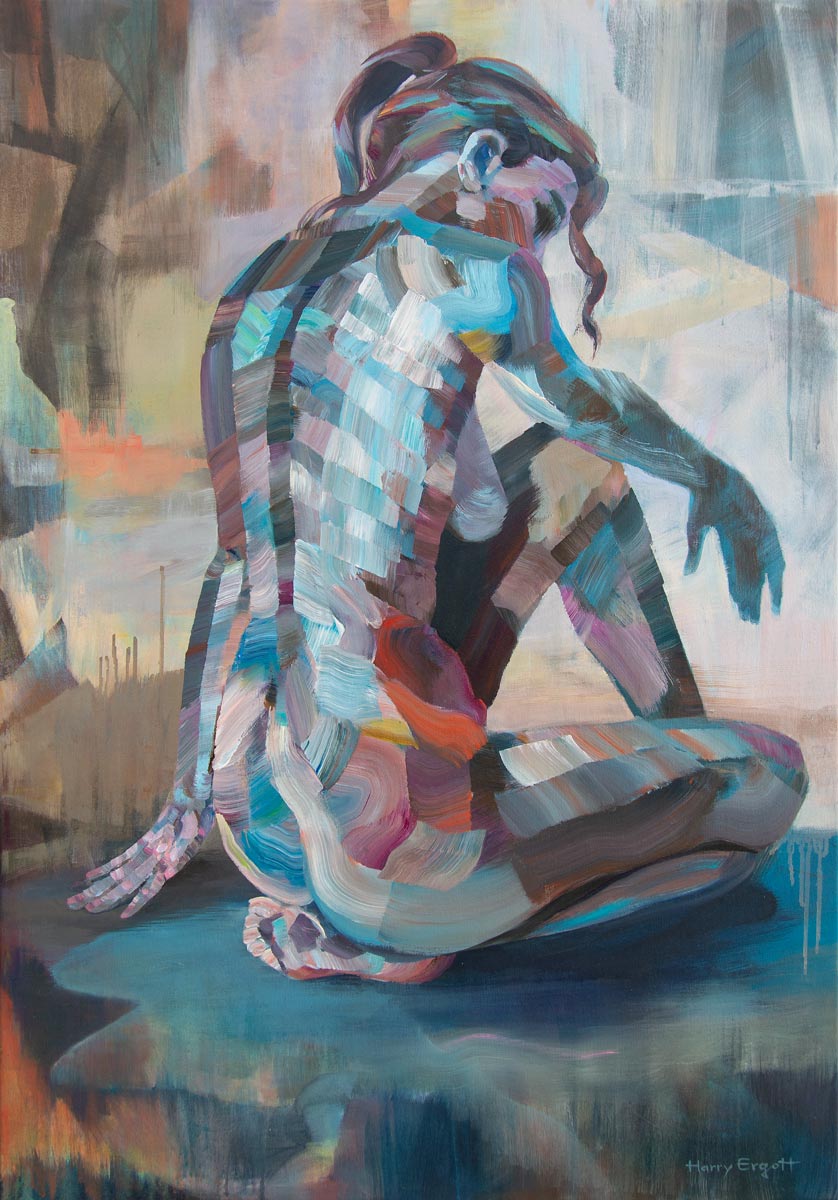 In “Ethereal” verschmilzt Körperlichkeit mit Abstraktion auf eindrucksvolle Weise. Der österreichische Künstler Harry Ergott inszeniert eine nach innen gekehrte Figur in einer kontemplativen Pose, deren Form sich aus dynamischen, breiten Pinselstrichen zusammensetzt. Die farbliche Vielfalt – von kühlen Blau- und Violetttönen bis zu warmen Akzenten in Orange und Rosa – verleiht der Darstellung eine fast überirdische Qualität.