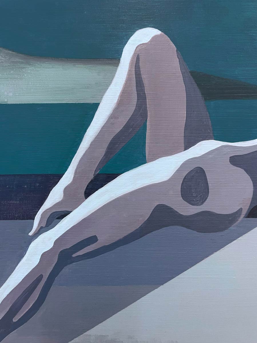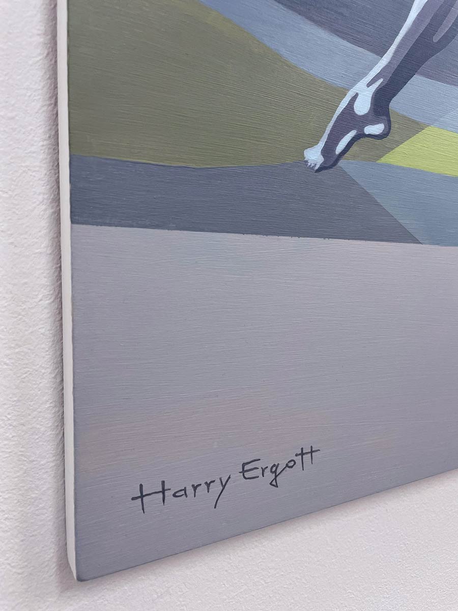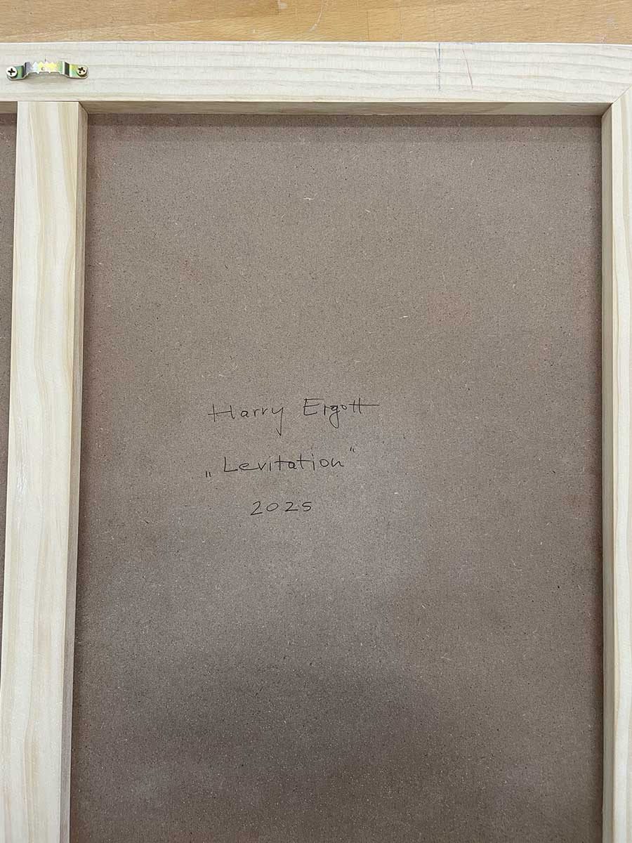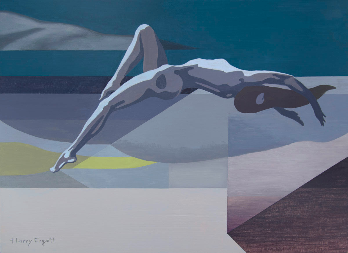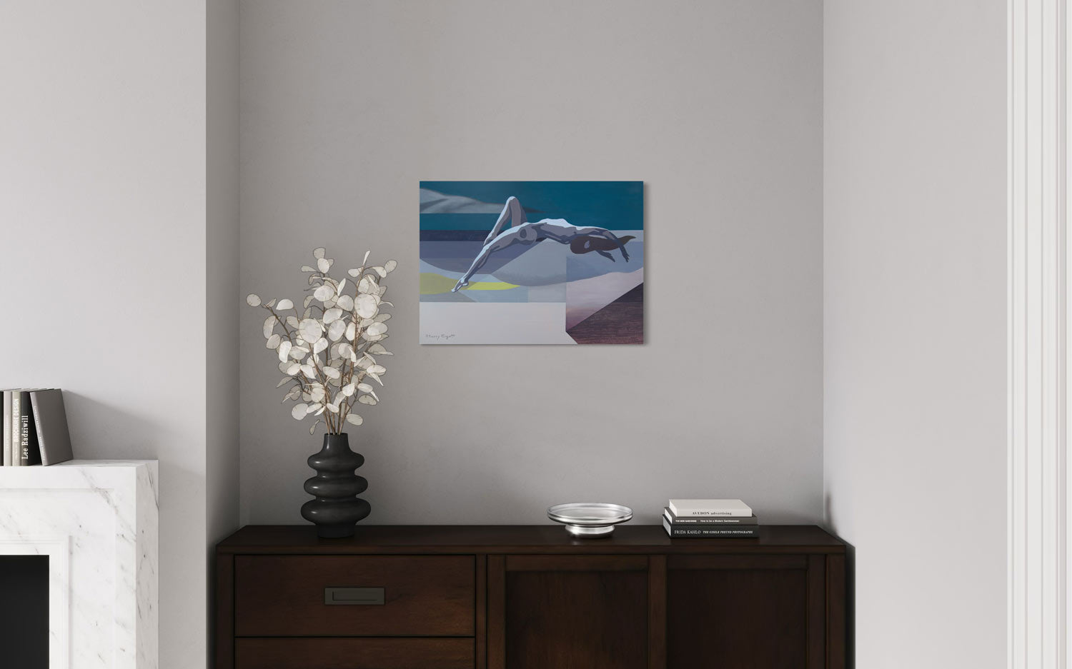 In Levitation hebt Harry Ergott die Figur von der Schwerkraft der Welt ab – und inszeniert einen Zustand der Schwebe, der zwischen Traum, Auflösung und Transzendenz oszilliert. Der weibliche Körper liegt horizontal ausgestreckt, schwebt über einer abstrakt konstruierten, geometrischen Landschaft. Doch obwohl sie ruht, ist nichts starr: Licht und Schatten modellieren die Figur plastisch, fast skulptural, während die Komposition gleichzeitig einen entrückten, unwirklichen Eindruck hinterlässt.