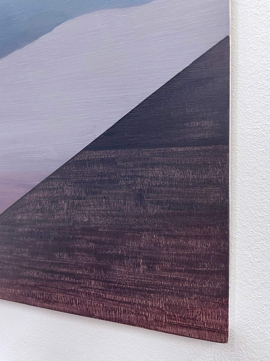 Die Farbpalette bewegt sich in kühlen Grau-, Blau- und Violetttönen, durchbrochen von einem gezielten Akzent in Zitronengelb – eine Art metaphysisches Leuchten, das den Bildraum subtil auflädt. Die Formensprache ist reduziert und präzise, was der Szene eine meditative Ruhe verleiht. Der Hintergrund wirkt wie eine symbolische Bühne: nicht konkret, aber voller Andeutungen von Natur, Horizont und Raum.