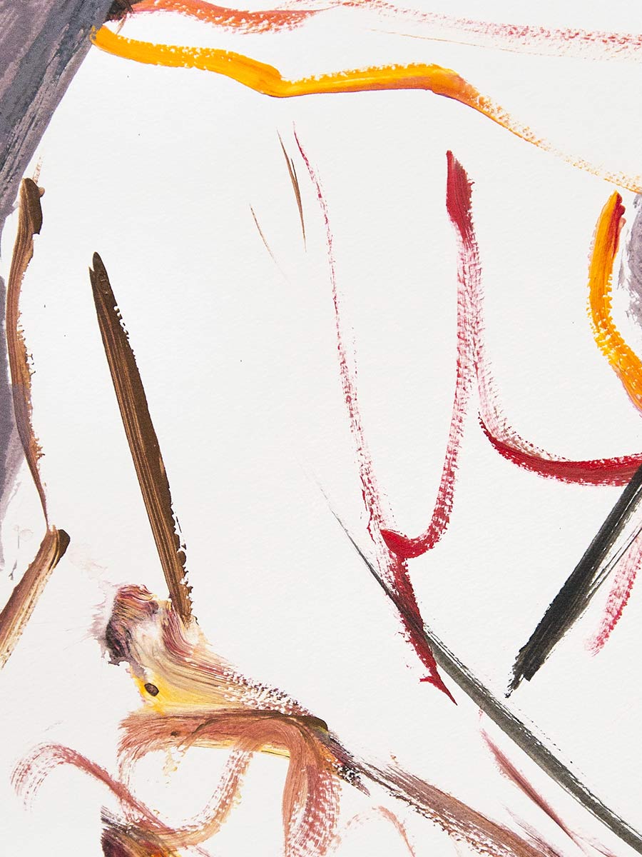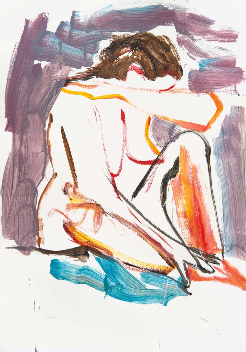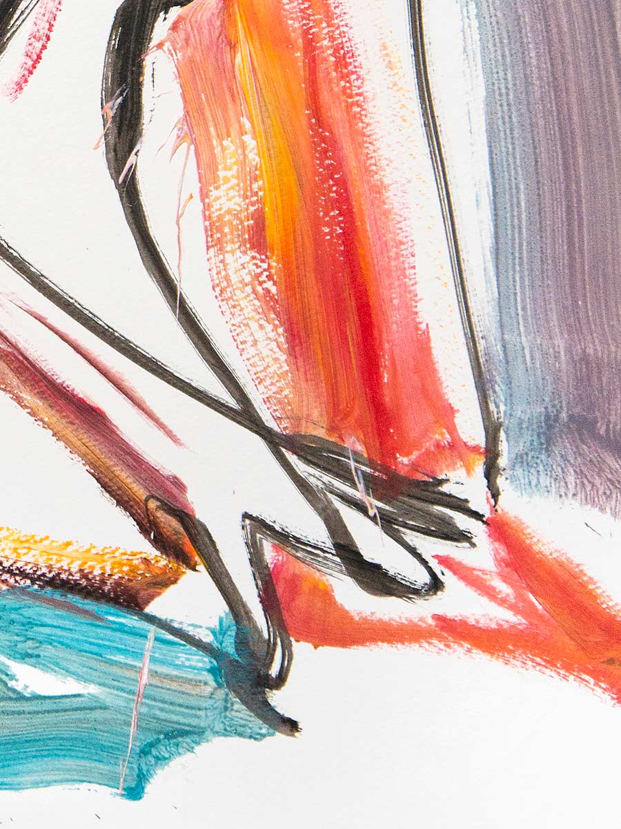 Die expressive Farbpalette – von leuchtendem Orange über tiefes Violett bis zu kräftigem Türkis – steht in spannendem Kontrast zur zarten Transparenz des Weißraums. Der Körper wirkt fragmentiert und zugleich vollständig, als wolle die Figur sich dem Blick entziehen und ihn doch herausfordern.