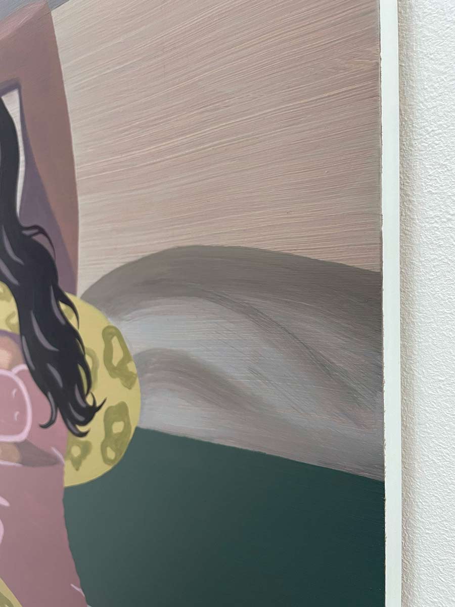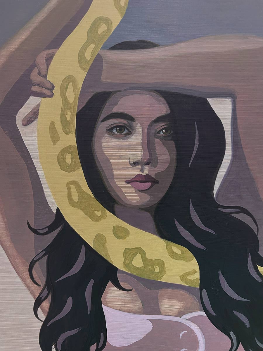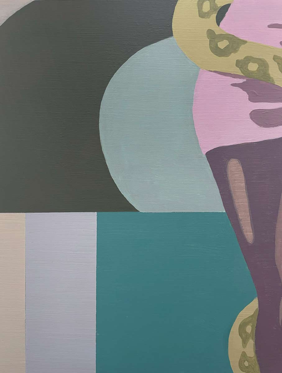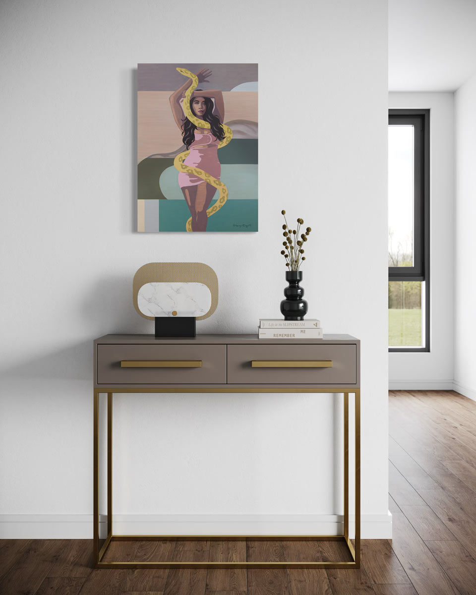 Die Bildsprache oszilliert zwischen stilisierter Figuration und grafischer Abstraktion. Klare Flächen, zurückhaltende Schattierungen und geometrisierte Raumkompositionen schaffen eine surreale Bühne für die Szene. Die Schlange, oft Sinnbild für Wandel, Wissen oder Verführung, windet sich elegant und ruhig um den Körper der Protagonistin – als wäre sie ein Teil von ihr. Die Farbpalette bleibt weich, doch spannungsgeladen: Pastelltöne treffen auf kräftige Kontraste, wodurch sich das Bild formal wie inhaltlich zwischen Harmonie und Spannung bewegt.