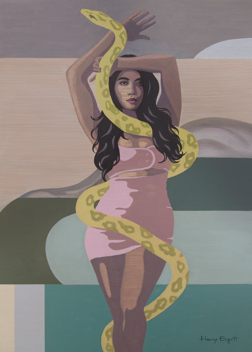 Mit Nature’s Daughter inszeniert Harry Ergott eine kraftvolle und zugleich ambivalente Ikone weiblicher Selbstbestimmung. Im Zentrum steht eine Frau in einem engen rosafarbenen Kleid, umwunden von einer gelbgrünen Schlange – ein Motiv voller Symbolik, das sich zwischen Mythos, Versuchung und Stärke bewegt. Die Pose ist selbstbewusst, fast skulptural, während der Blick der Figur wach und direkt den Betrachter trifft. Sie ist keine Muse, keine Projektion – sie ist souveränes Subjekt.