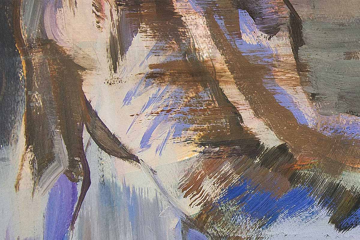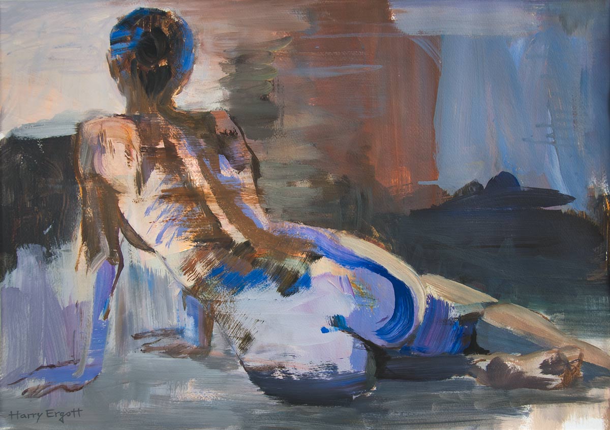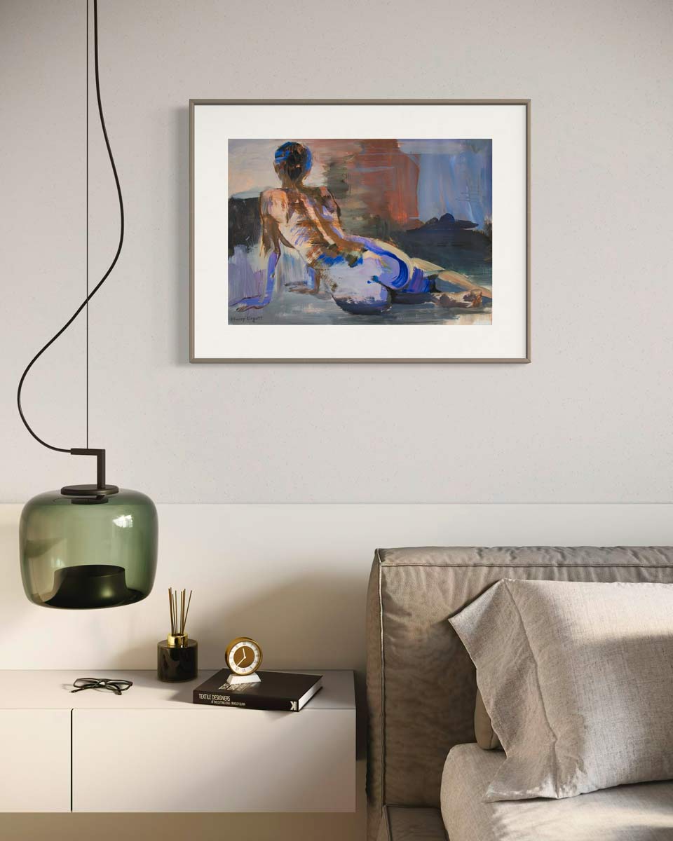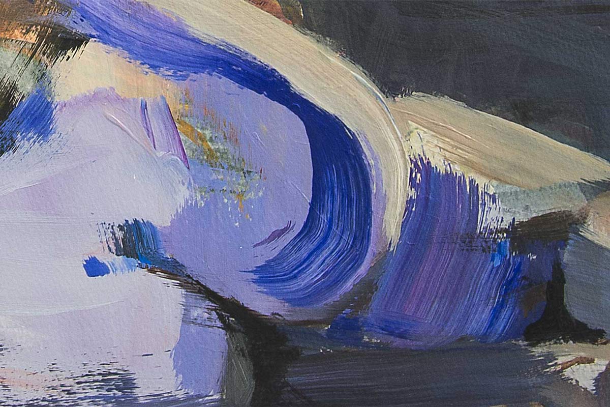 Mit „Night Vision“ erschafft Harry Ergott ein faszinierendes Wechselspiel aus Licht und Schatten, Ruhe und Bewegung. Die liegende weibliche Figur ist rückseitig dargestellt, von einer geheimnisvollen Lichtquelle angestrahlt, die ihre Silhouette in irisierende Farbschichten aus Blau, Violett und Erdtönen taucht.