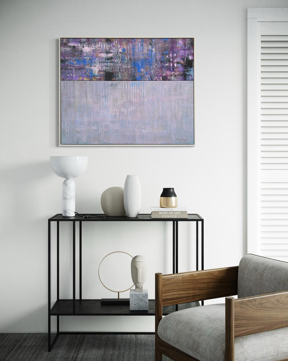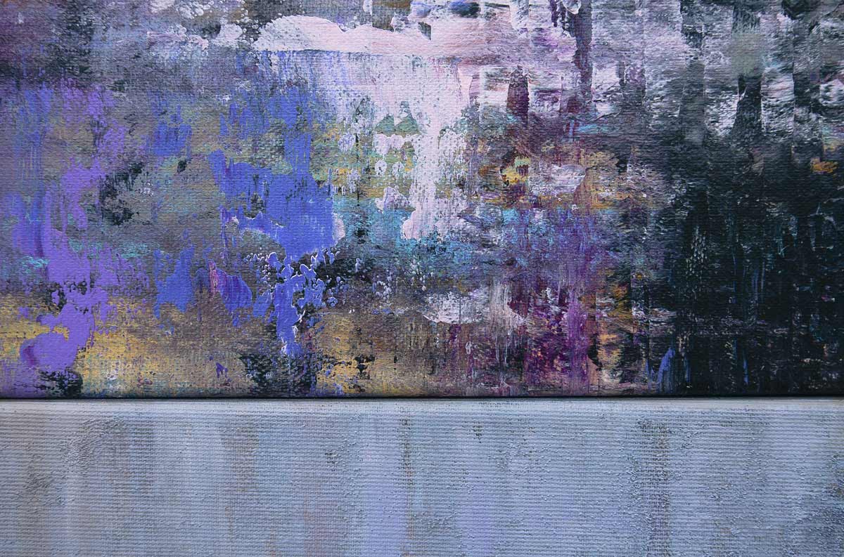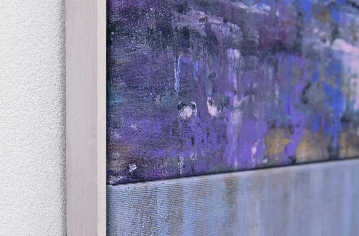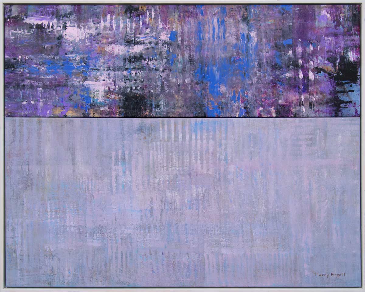 Mit Reflections zeigt Harry Ergott eine neue Facette seines künstlerischen Schaffens, in der sich gegenstandslose Malerei und emotionale Tiefenwirkung eindrucksvoll vereinen. Das Werk ist in zwei deutlich voneinander getrennte Zonen unterteilt: Ein lebendiger, farbintensiver oberer Bereich in Violett-, Blau- und Schwarznuancen steht einem ruhigen, fast meditativen unteren Abschnitt gegenüber, der in zurückhaltenden Grau- und Silbertönen gehalten ist.
