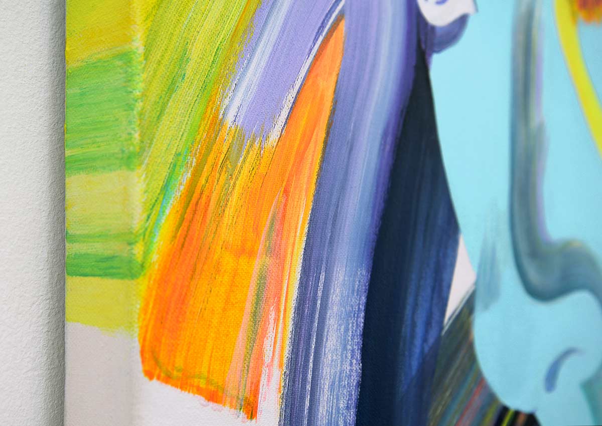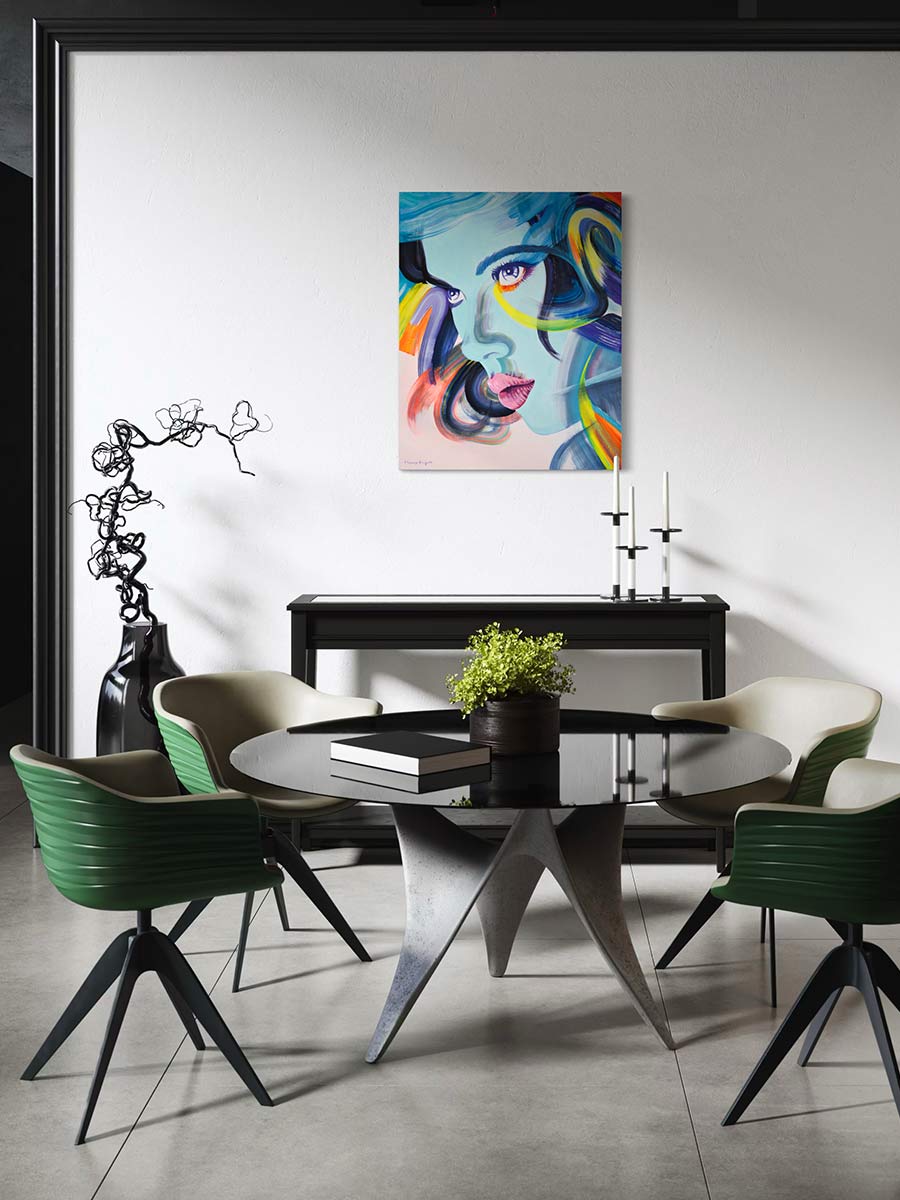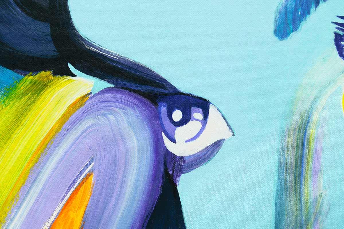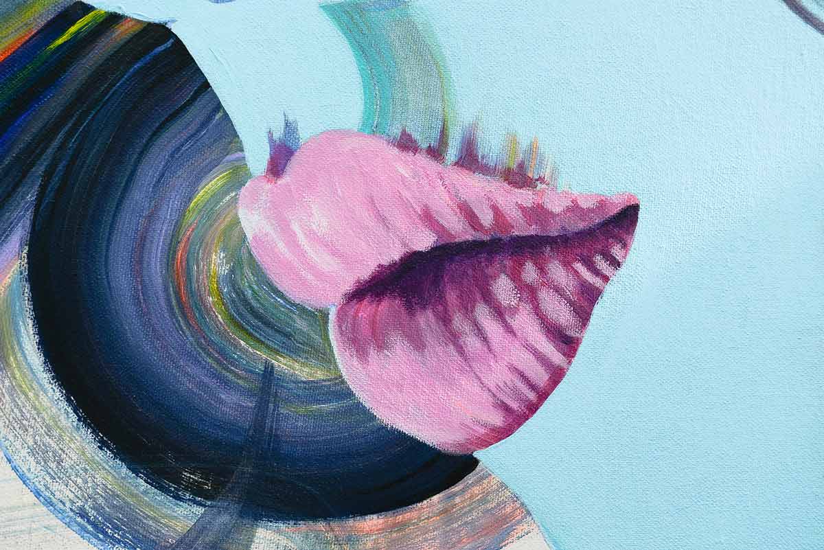 In Scarlett – Hyper Senses entfaltet Harry Ergott ein visuelles Spektrum voller Intensität und Sinnlichkeit. Das Porträt der Schauspielerin Scarlett Johansson wird zur Bühne eines expressiven Farbenspiels, in dem Pinselstriche wie Lichtstrahlen über die Leinwand tanzen. Die blaue Haut der Figur kontrastiert mit lebhaften Akzenten in Neonfarben, die sich wie Energieimpulse durch das Bild ziehen. Augen und Lippen wirken beinahe hyperreal – überhöht in ihrer Emotionalität und Präsenz.