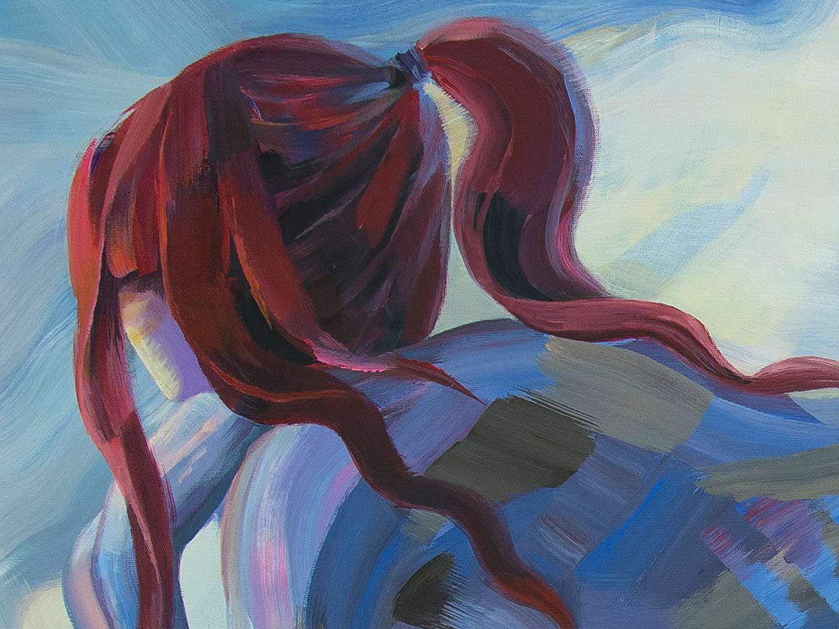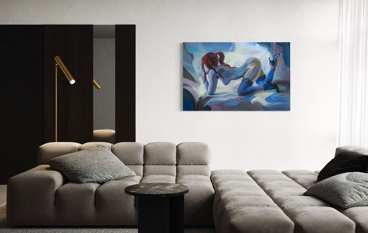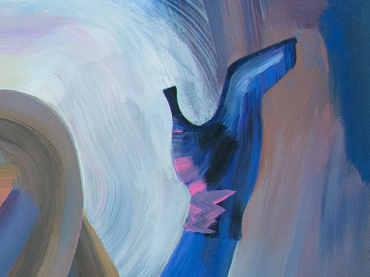 Die Farbflächen gleiten in kräftigen, energiegeladenen Strichen über die Leinwand, als würde Licht am Körper entlangfließen und ihn immer wieder neu erfinden. Blau- und Violetttöne umhüllen die Figur wie ein flüssiger Schatten, während warme Highlights ihre Körperlinien hervorheben. Die Szene wirkt entrückt, zugleich intim und kraftvoll, fast wie ein Moment zwischen Traum und Aufbruch.