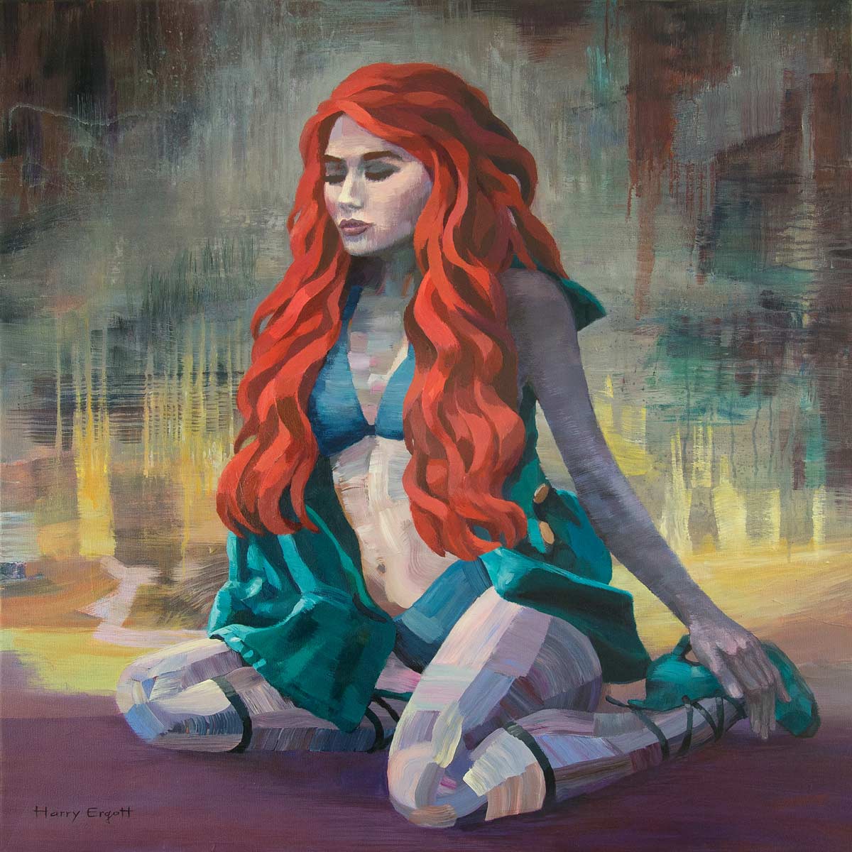 In Sensual Sanctuary begegnet uns eine junge Frau mit auffallend flammend-rotem Haar, die in sich versunken auf dem Boden sitzt. Die Haltung wirkt gelöst und doch konzentriert – ein Moment der Introspektion oder vielleicht des inneren Friedens. Der Hintergrund pulsiert in changierenden Farben zwischen Dunkelheit und Licht, abstrahiert, beinahe träumerisch – ein atmosphärischer Schutzraum, in dem die Figur aufgehoben scheint.