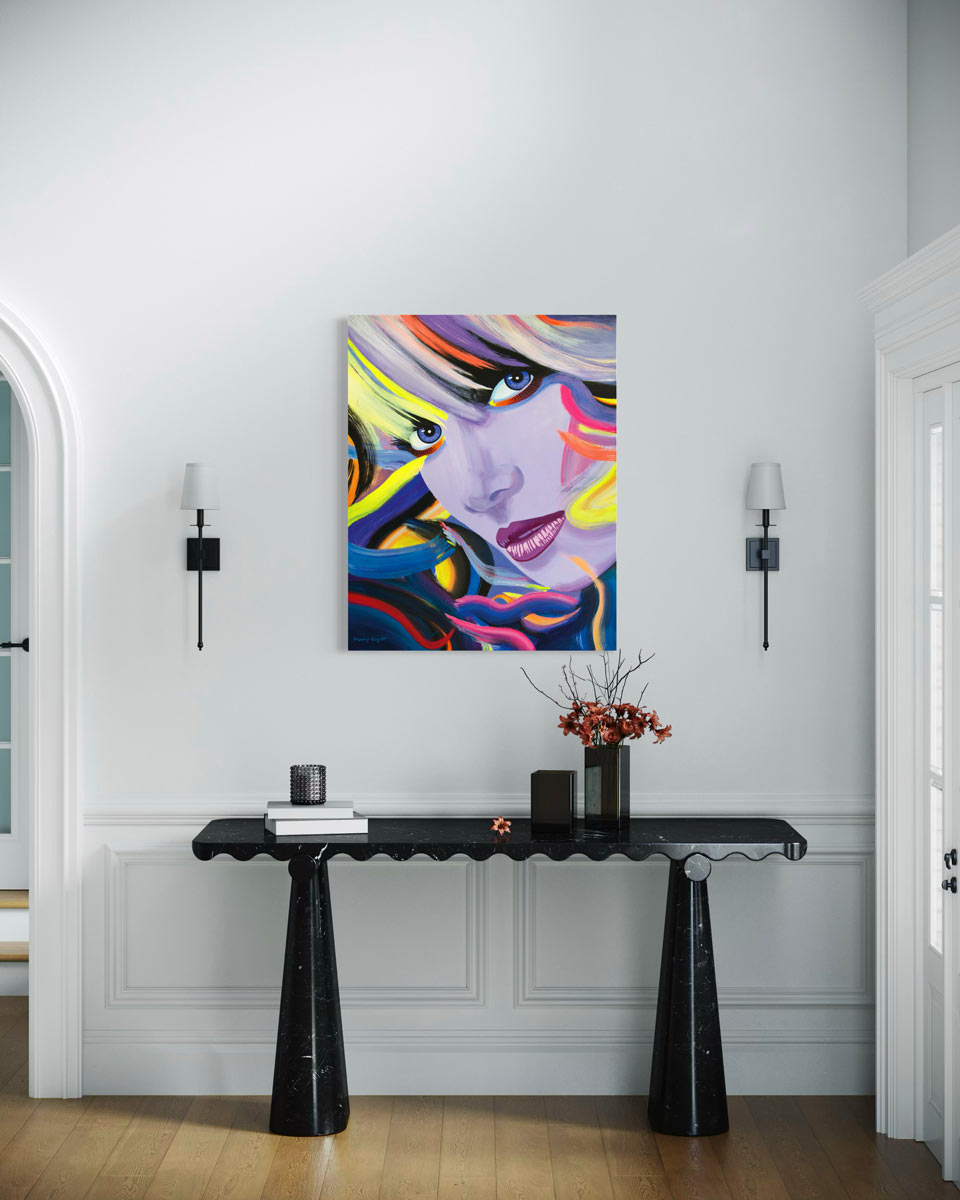 Die farbgewaltige Komposition zelebriert Weiblichkeit, Stärke und Individualität in einem modernen, fast psychedelischen Stil.