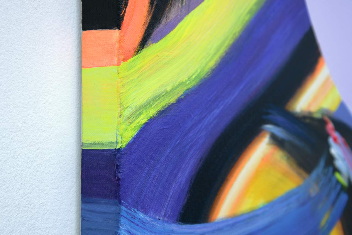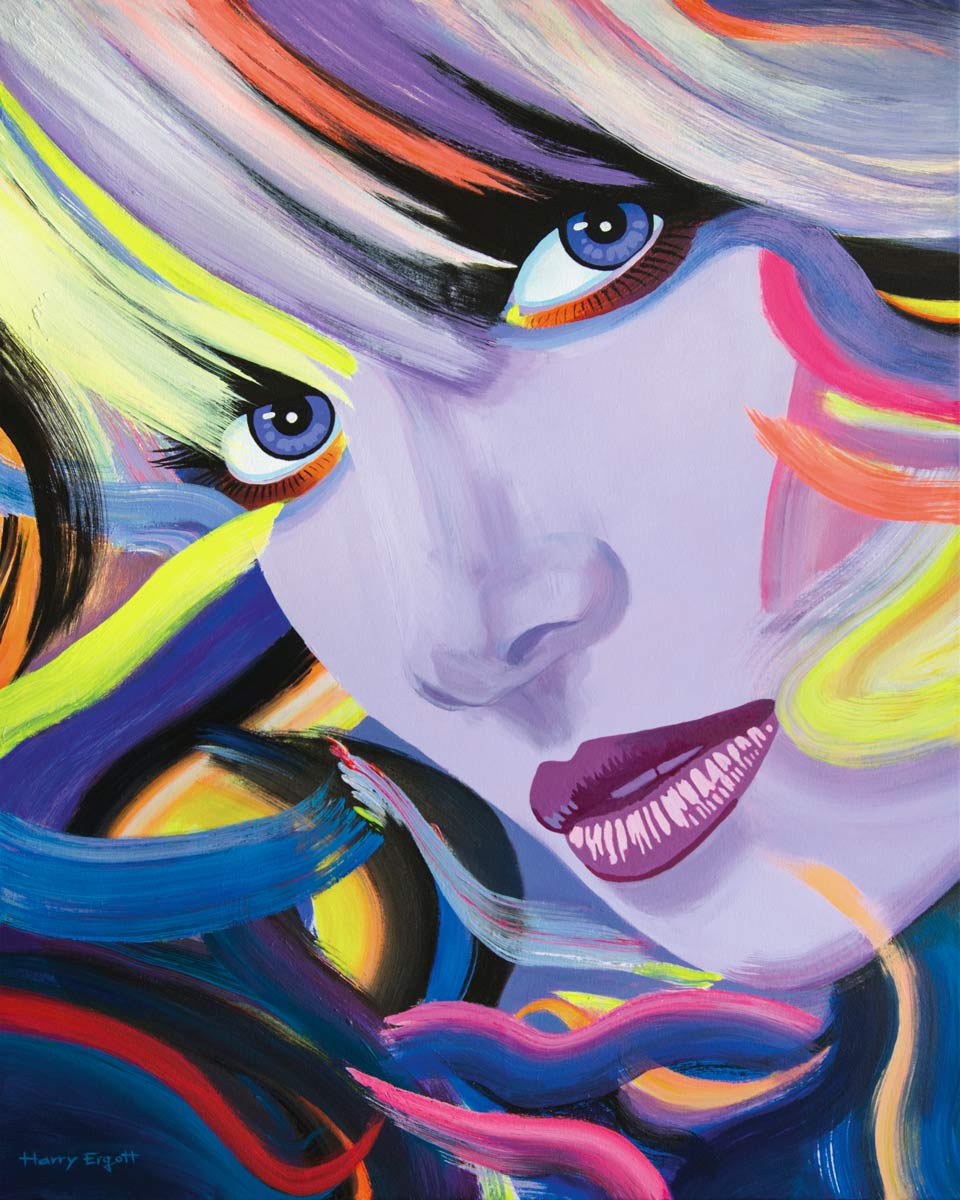 Storm ist ein visuelles Gewitter aus Farbe, Emotion und Ausdruck. Das Porträt einer Frau zieht den Blick sofort in ihren Bann – intensiv, selbstbewusst, fast überlebensgroß. Ihre Augen leuchten wie Blitze im Sturm, ihr Haar tanzt in explosiven Pinselstrichen aus Neon, Violett und Schwarz.