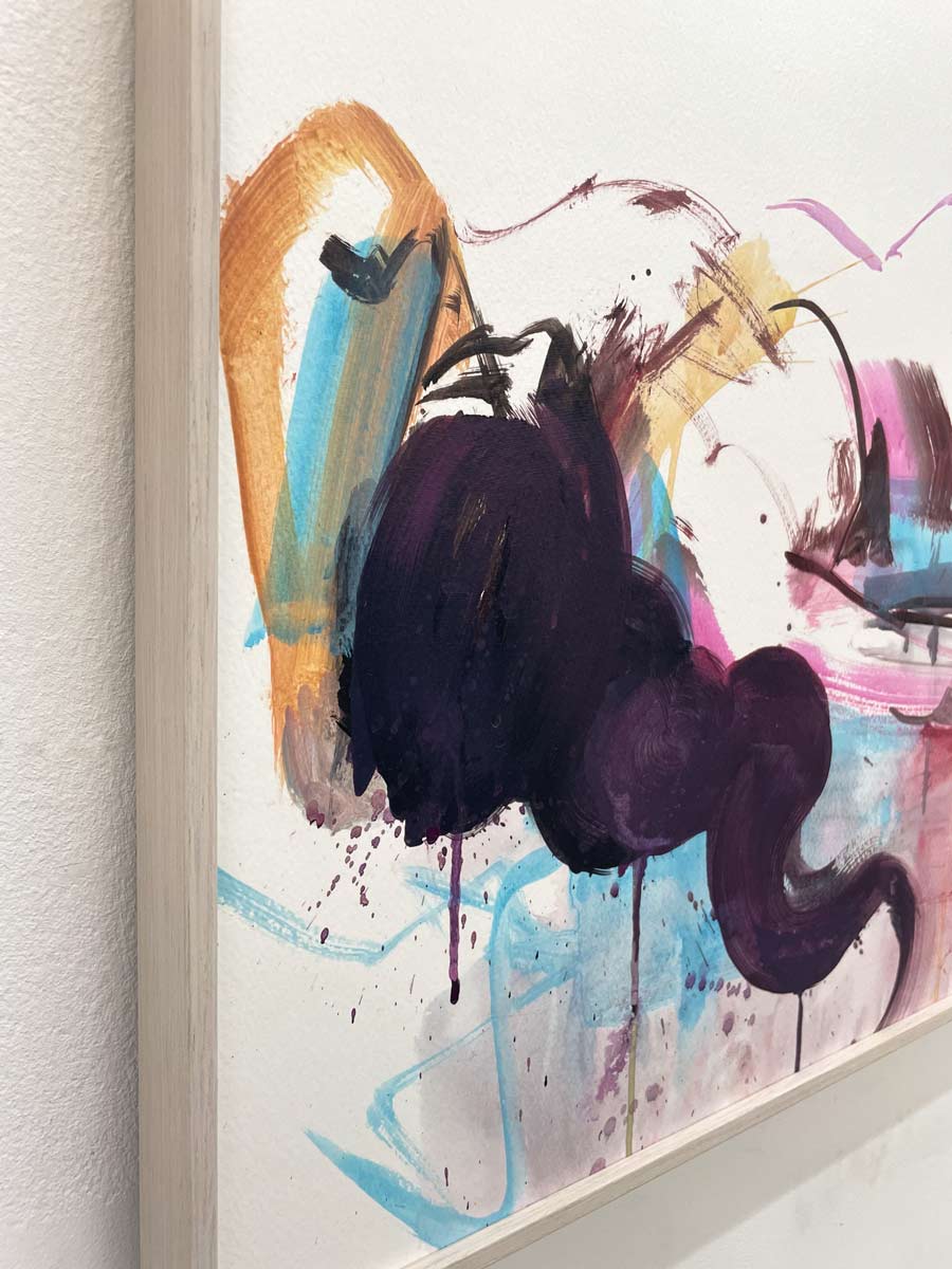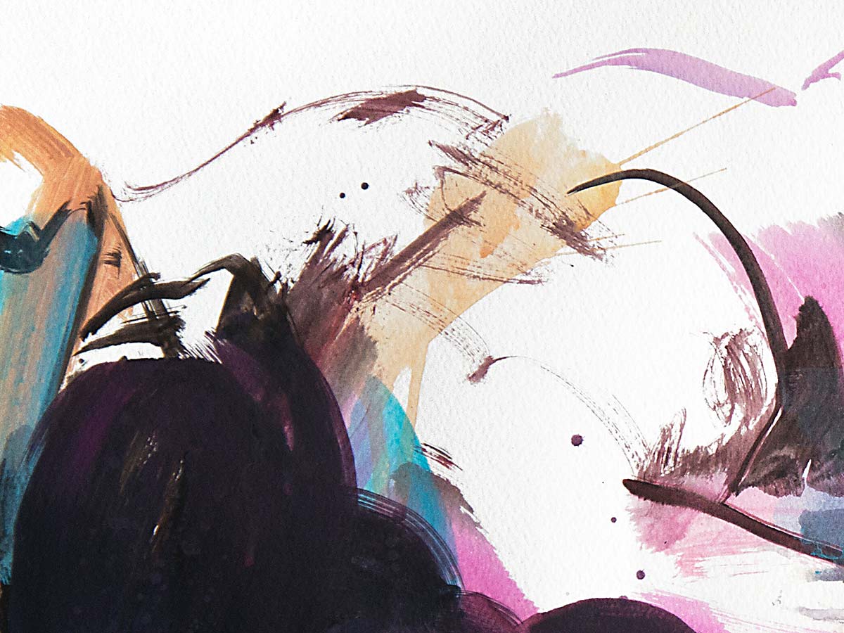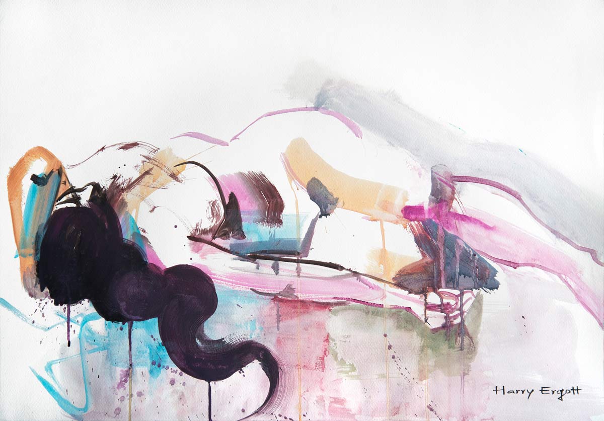 In Sweet Dreams verwischt Harry Ergott auf eindrucksvolle Weise die Grenzen zwischen Abstraktion und Figuration. Die liegende Aktfigur entsteht durch kraftvolle, expressive Pinselstriche und leuchtende Farben – tiefe Purpurtöne, elektrisches Blau, zarte Rosatöne und erdige Akzente. Die Figur scheint sich im Bildraum aufzulösen, als befände sie sich in einem Schwebezustand zwischen Traum und Wirklichkeit.