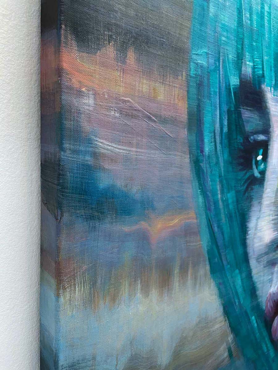 Die Oberfläche des Bildes ist von horizontalen Pinselzügen geprägt, die an digitale Interferenzen oder irisierende Lichtbrechungen erinnern. Dadurch wirkt das Gesicht wie in Bewegung oder von einem Hauch von Magie umgeben. Die gezielte Unschärfe und das Spiel mit Übergängen zwischen Figur und Raum verleihen dem Werk eine tranceartige Tiefe.