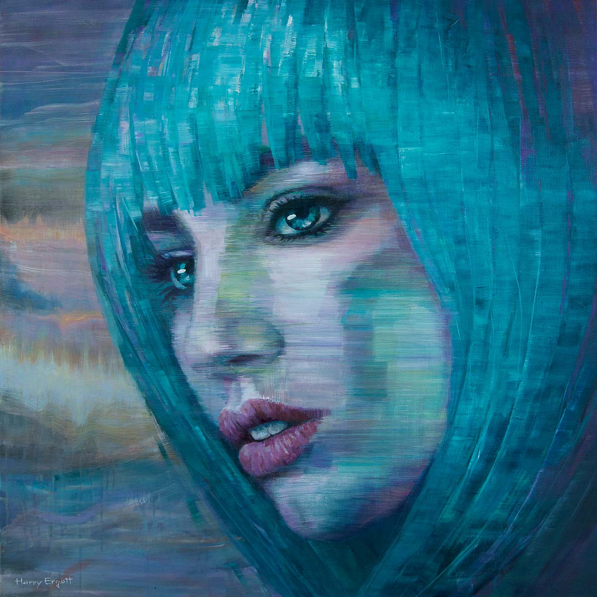 Im Zentrum von The Divination steht ein expressives Porträt, das sich in intensiven Türkis- und Violetttönen entfaltet. Der Blick der Frau ist leicht abgewandt und scheint in eine andere Sphäre zu reichen. Das Haar verschmilzt mit dem Hintergrund zu einem flirrenden Farbfeld – als wäre sie selbst Teil einer visionären Landschaft.