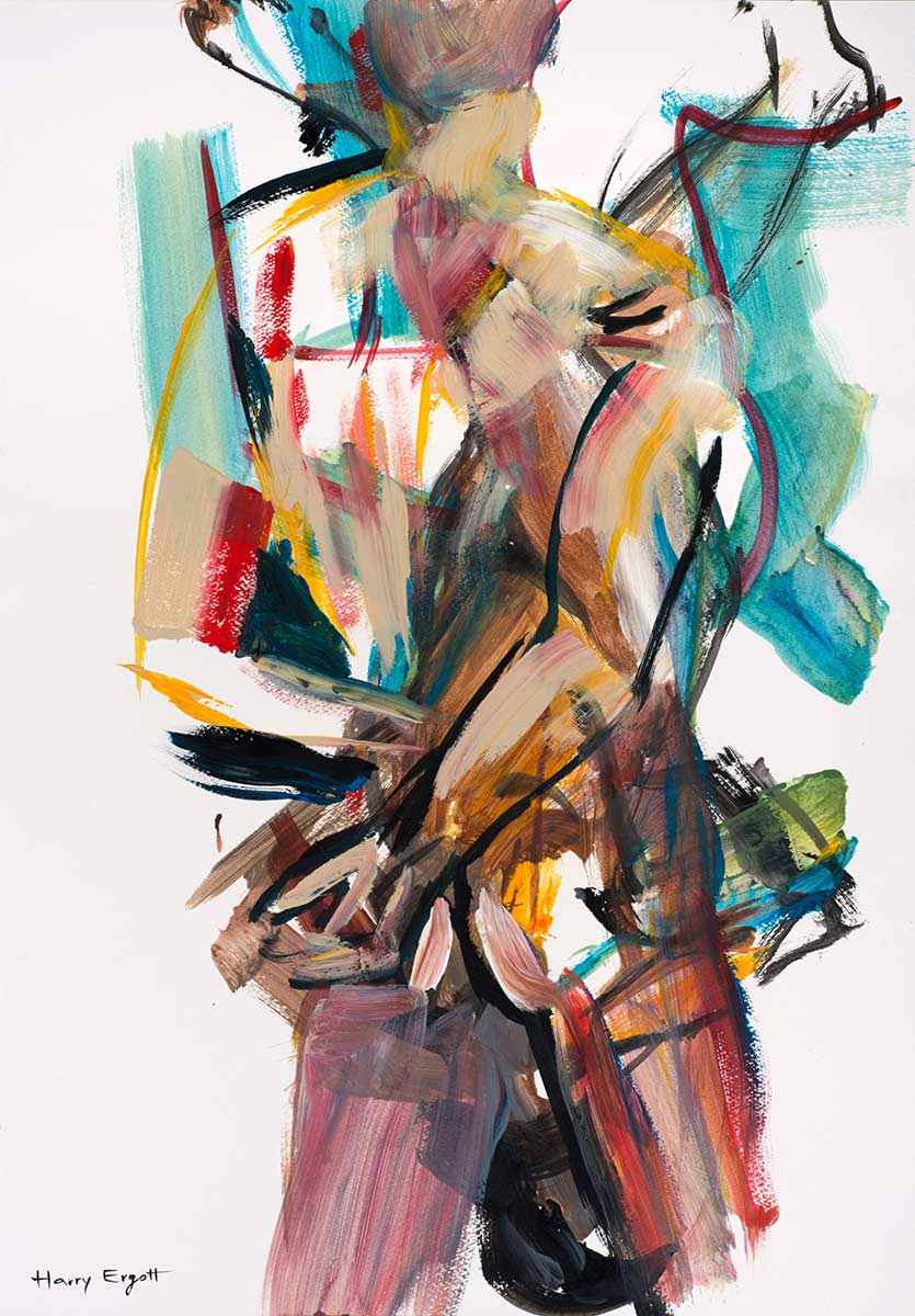 Mit The Guardian erschafft Harry Ergott eine kraftvolle und zugleich geheimnisvolle Figur, die sich zwischen Abstraktion und Figuration bewegt. Der Körper erscheint nur fragmentarisch, zusammengesetzt aus impulsiven Pinselstrichen, kraftvollen Farben und einer fast tänzerischen Linienführung. Der dominante Einsatz von Türkis-, Erd- und Rosétönen erzeugt ein spannungsreiches Farbklima, das sowohl Schutz als auch Verletzlichkeit suggeriert. Die Pose – eine rückwärtige Ansicht mit überkreuzten Armen – wirkt wie eine Geste des Rückhalts oder der Abwehr. So öffnet das Bild einen Interpretationsraum für Themen wie Stärke, Verantwortung und emotionale Präsenz. Ergott gelingt es einmal mehr, die Grenze zwischen Sichtbarem und Gefühltem verschwimmen zu lassen.