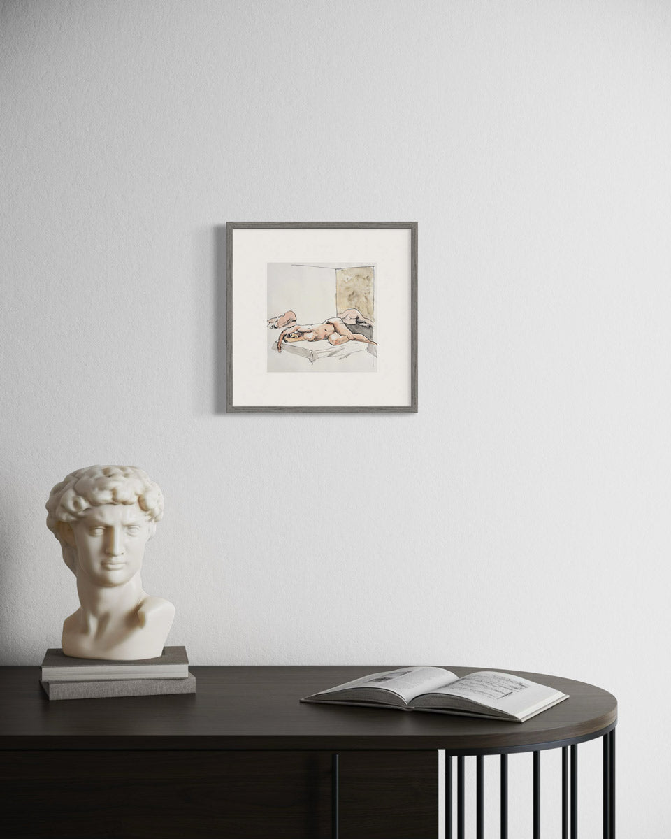 In “The Mirrors” entfaltet sich eine stille, intime Szene – fragmentarisch und dennoch umfassend. Der Körper wird nicht nur zum Motiv, sondern zum Medium der Reflexion: Zwischen Perspektive und Projektion, Fleisch und Fläche. Die Linien wirken entschieden, fast grob, als wollten sie mehr erfassen als bloße Kontur. Gleichzeitig lässt die zarte Aquarellfarbe Raum für Verletzlichkeit und eine meditative Offenheit.