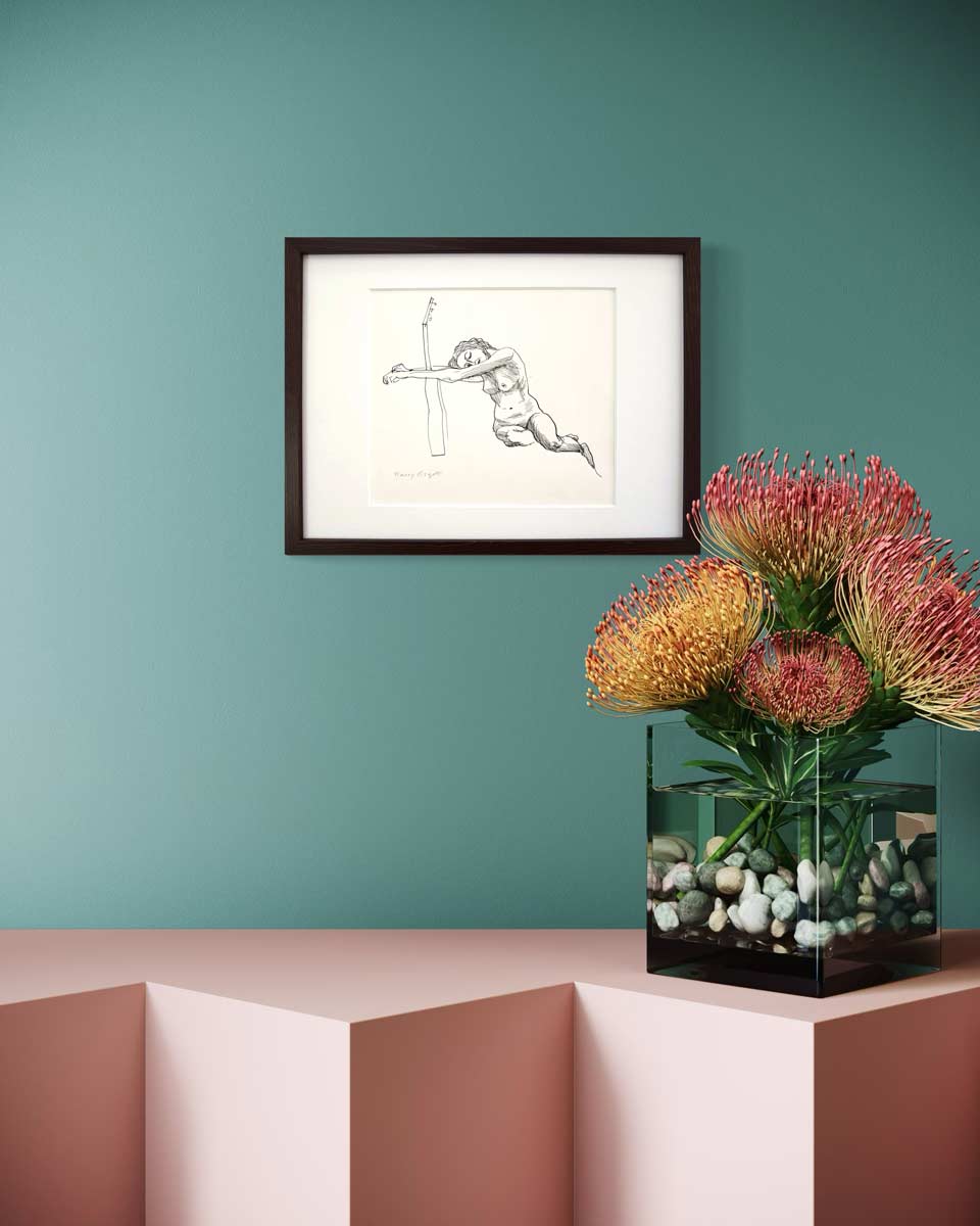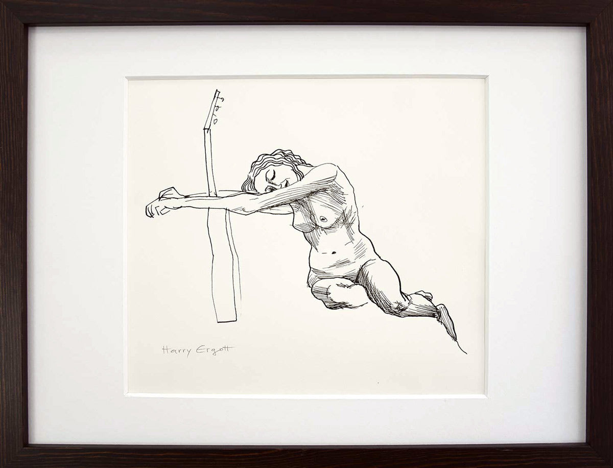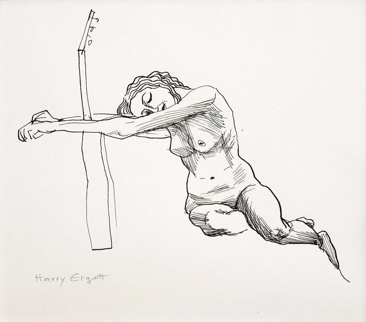 In The Muse reduziert Harry Ergott die Ausdrucksmittel auf das Wesentliche: Linie, Haltung und Geste. Mit feinem, kontrolliertem Strich skizziert er eine weibliche Figur, nackt und in sich versunken, die sich an eine abstrahierte Gitarre lehnt. Die Komposition erinnert an klassische Aktstudien, bricht jedoch durch das ungewöhnliche Requisit – die Gitarre – mit der Tradition.